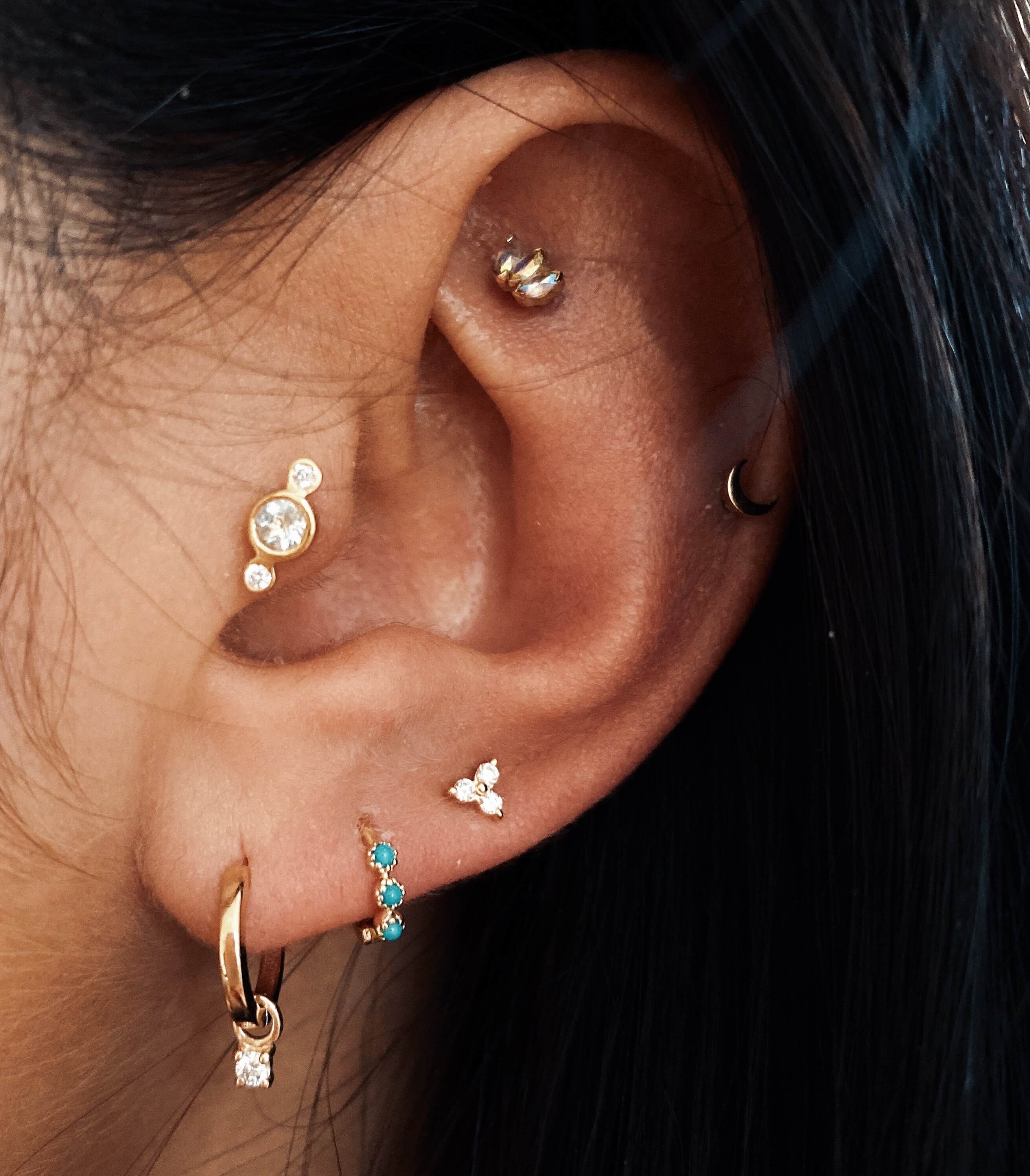 The hoop measures 10.6mm outside edge to outside edge, with a 8mm internal diameter and 1.4mm width. This gives a perfect close fit to your lobe. The hoop width measures 1.7mm. The post thickness is 0.9mm and 19 gauge.