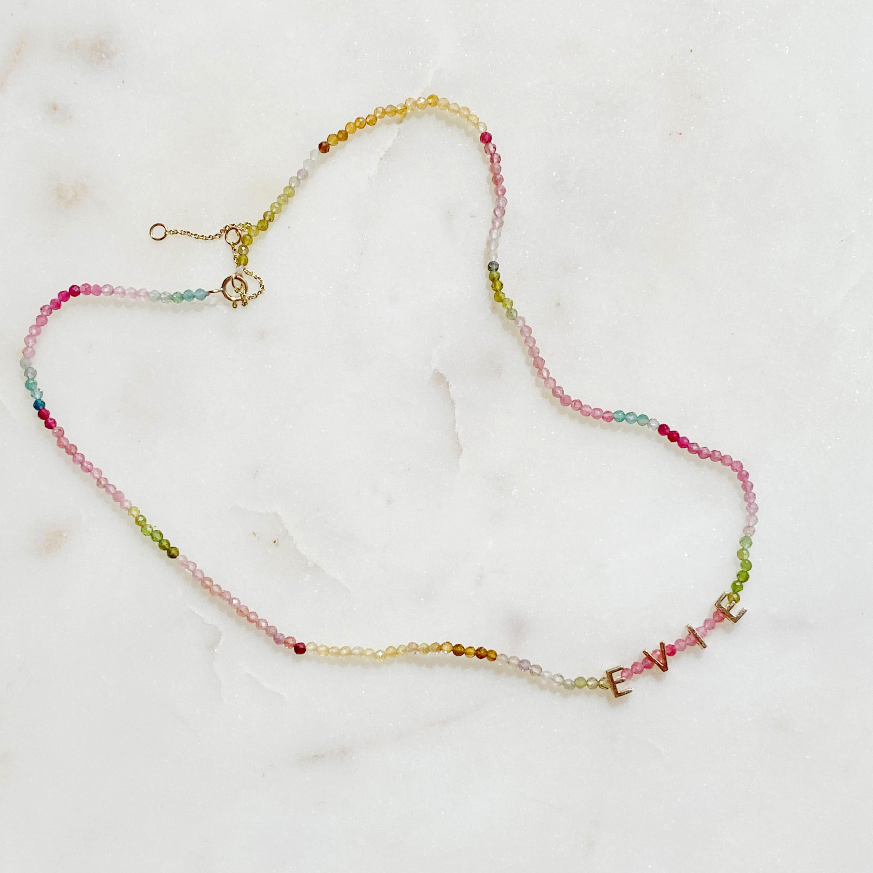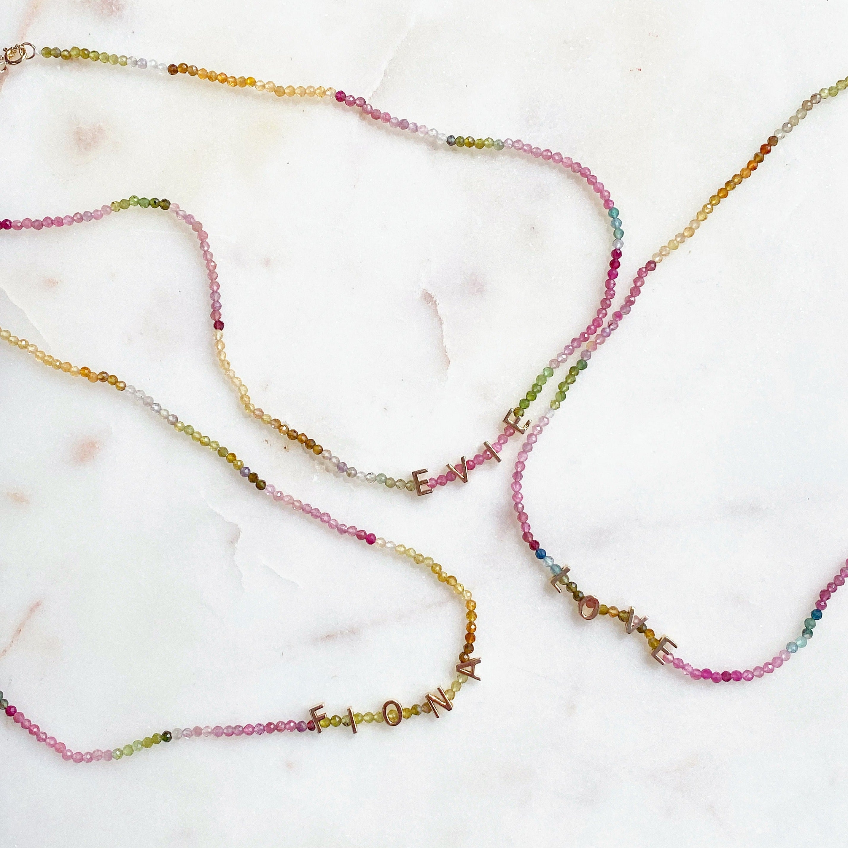 The Semi-Precious Beaded Name Necklace measures 15" in length with 2" extender chain so it can be worn at 15", 16" and 17". The letters & charms measure approx 5mm high.