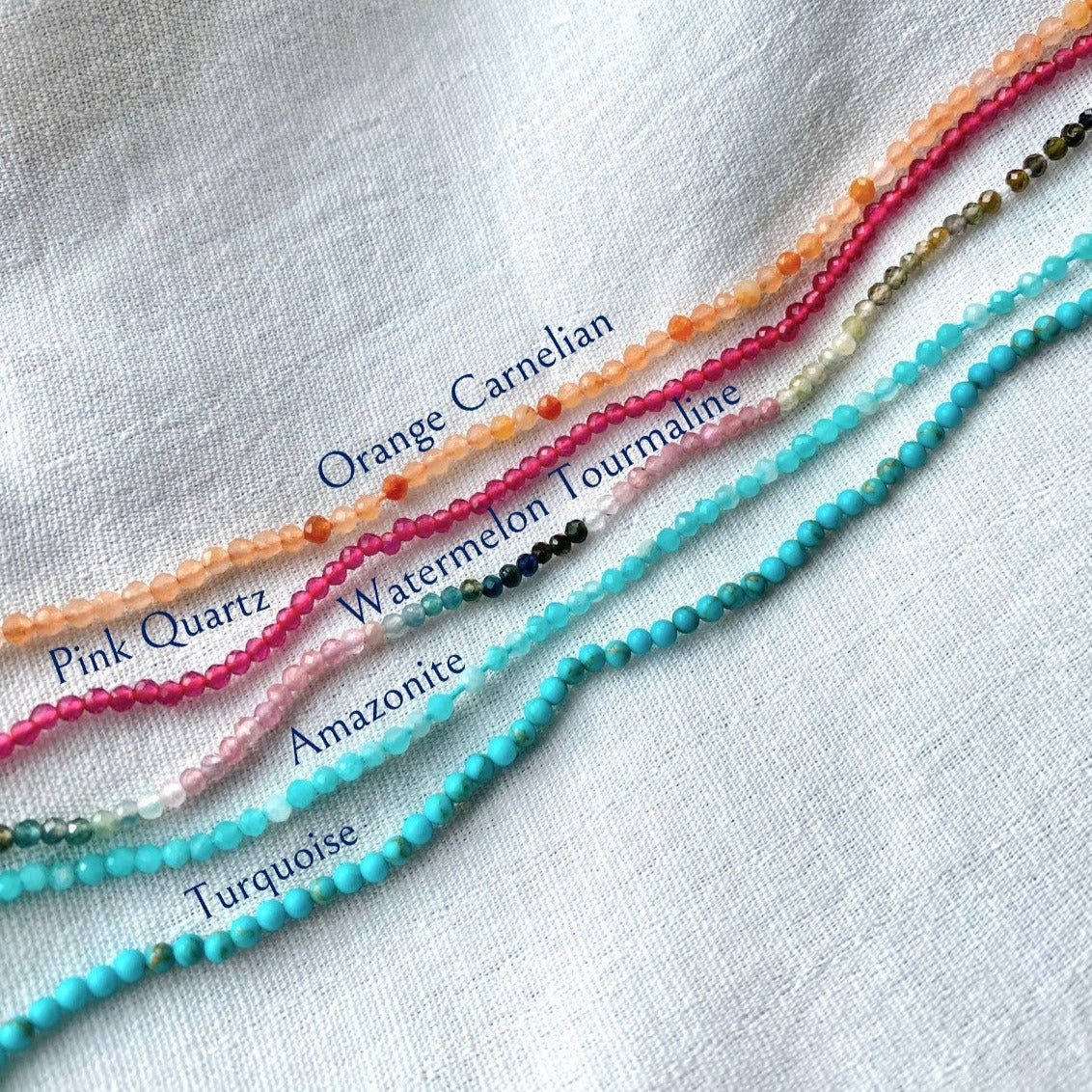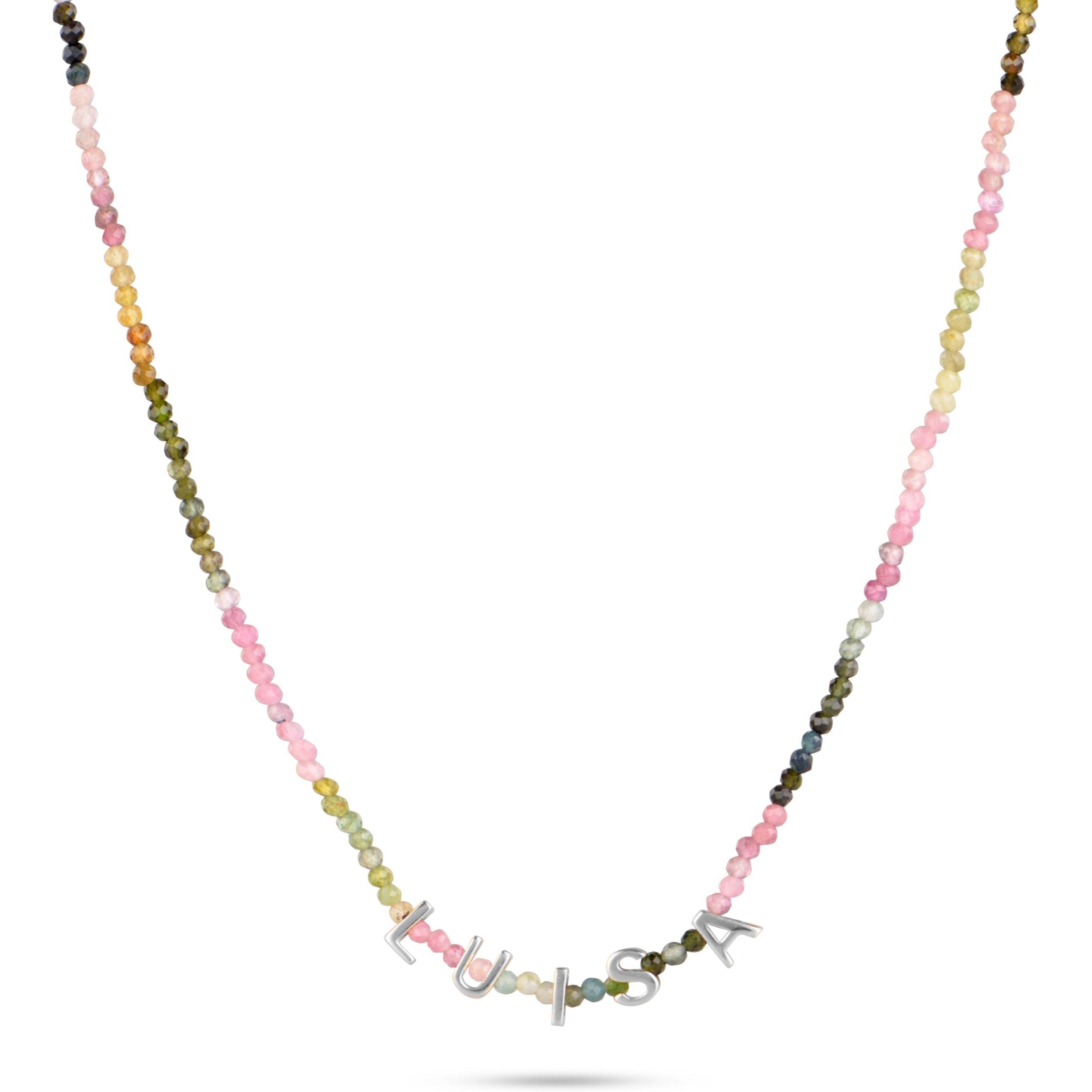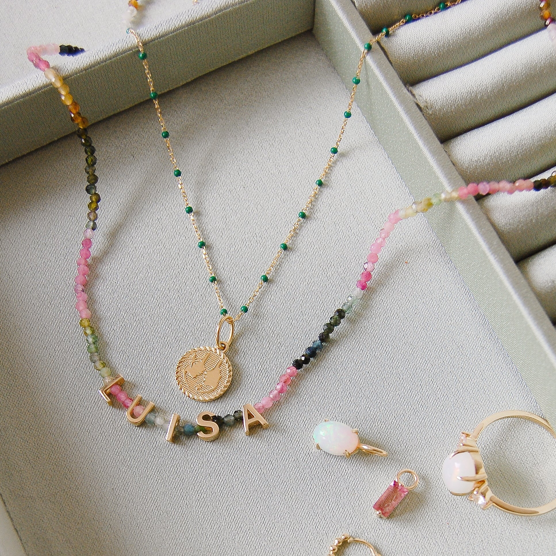 Create your own personal piece of jewellery. Choose beads from options like Watermelon Tourmaline, Amazonite, Turquoise, Pink Quartz or orange carnelian. Personalise with up to eight solid sterling silver letters. Create a unique piece with initials, symbols names, or meaningful words to wear every day.