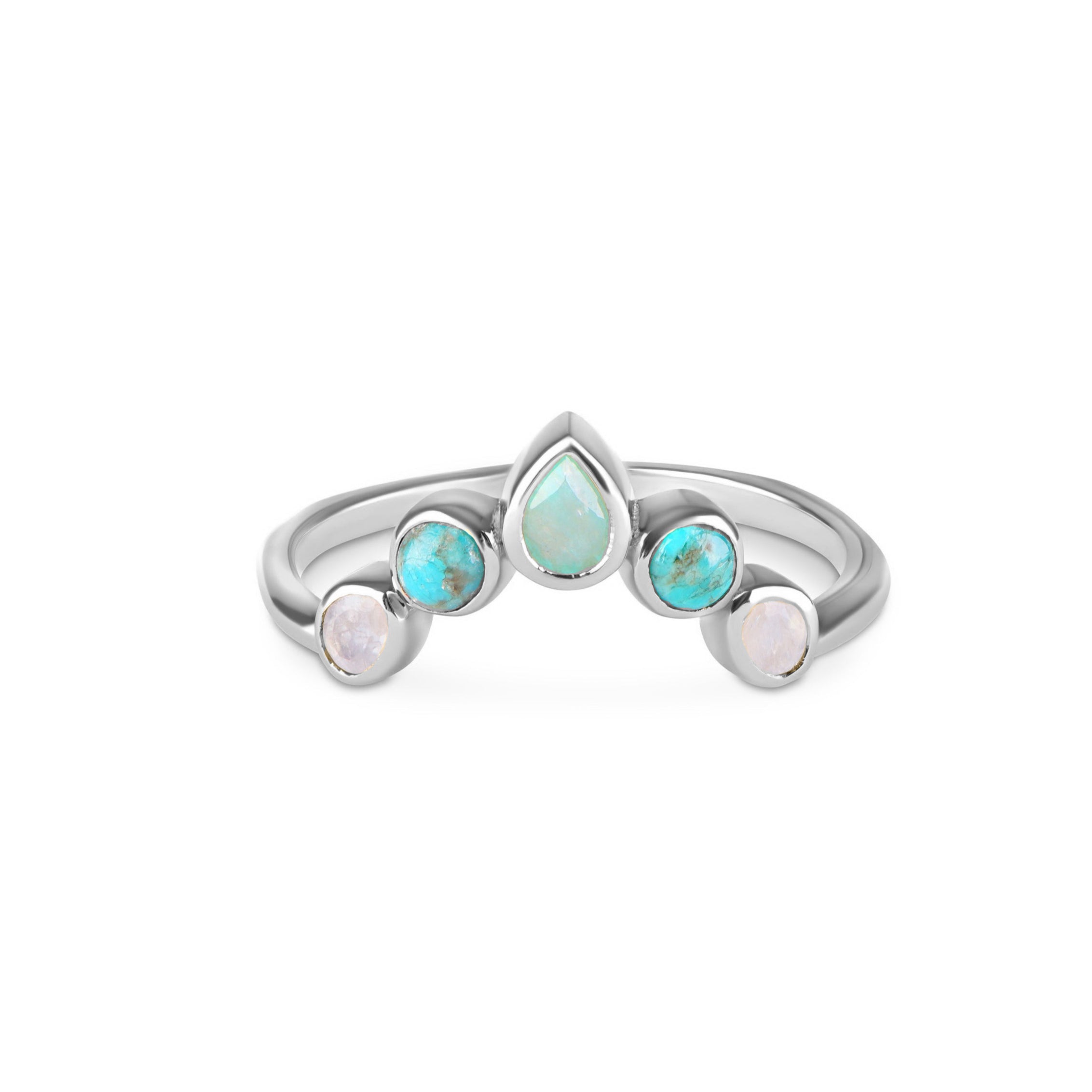 Embrace nature's beauty with our Semi-Precious Stone Hugging Ring! Featuring pear-shaped amazonite, moonstones, and copper turquoise stones set in sterling silver, this ring adds style while promoting balance and harmony.