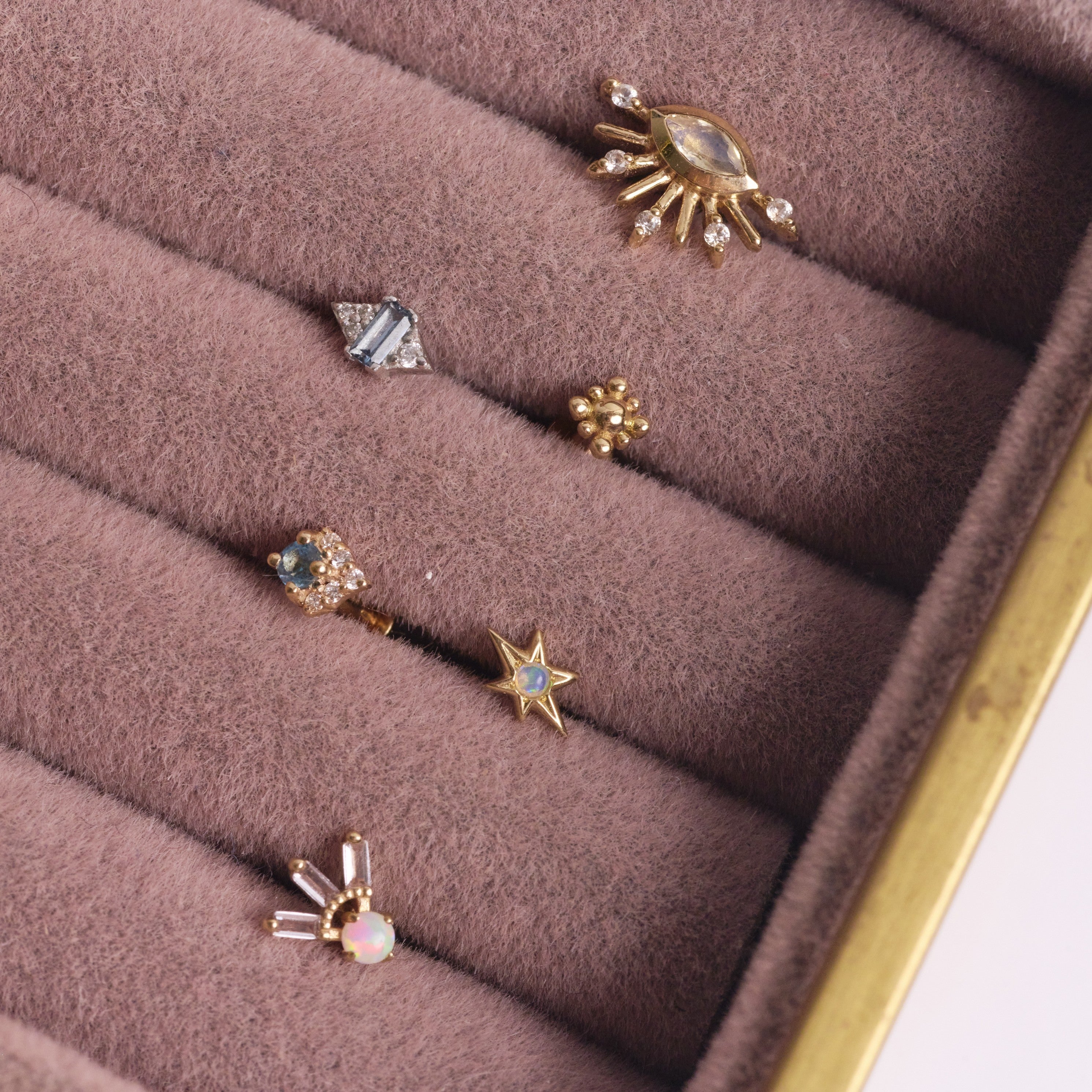 This 14k solid gold flat-back earring features a stunning opal star design, adding elegance and charm to any ear. Admire its shifting hues, from iridescent blues to soft pinks—shine like a star!