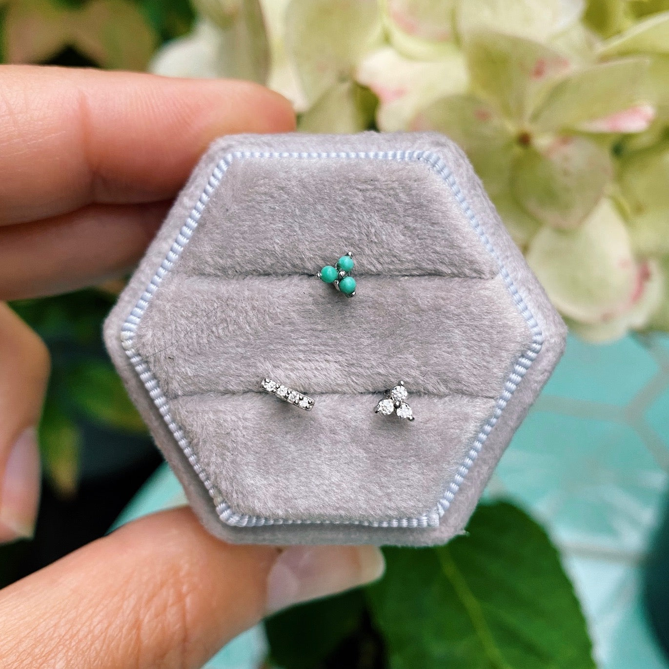 The Diamond Trilogy Flat Back measures 3.5mm x 4mm. Length of post is 5mm or 8mm and thickness is 1.2mm and 16 gauge. Disc at back measures 3mm.