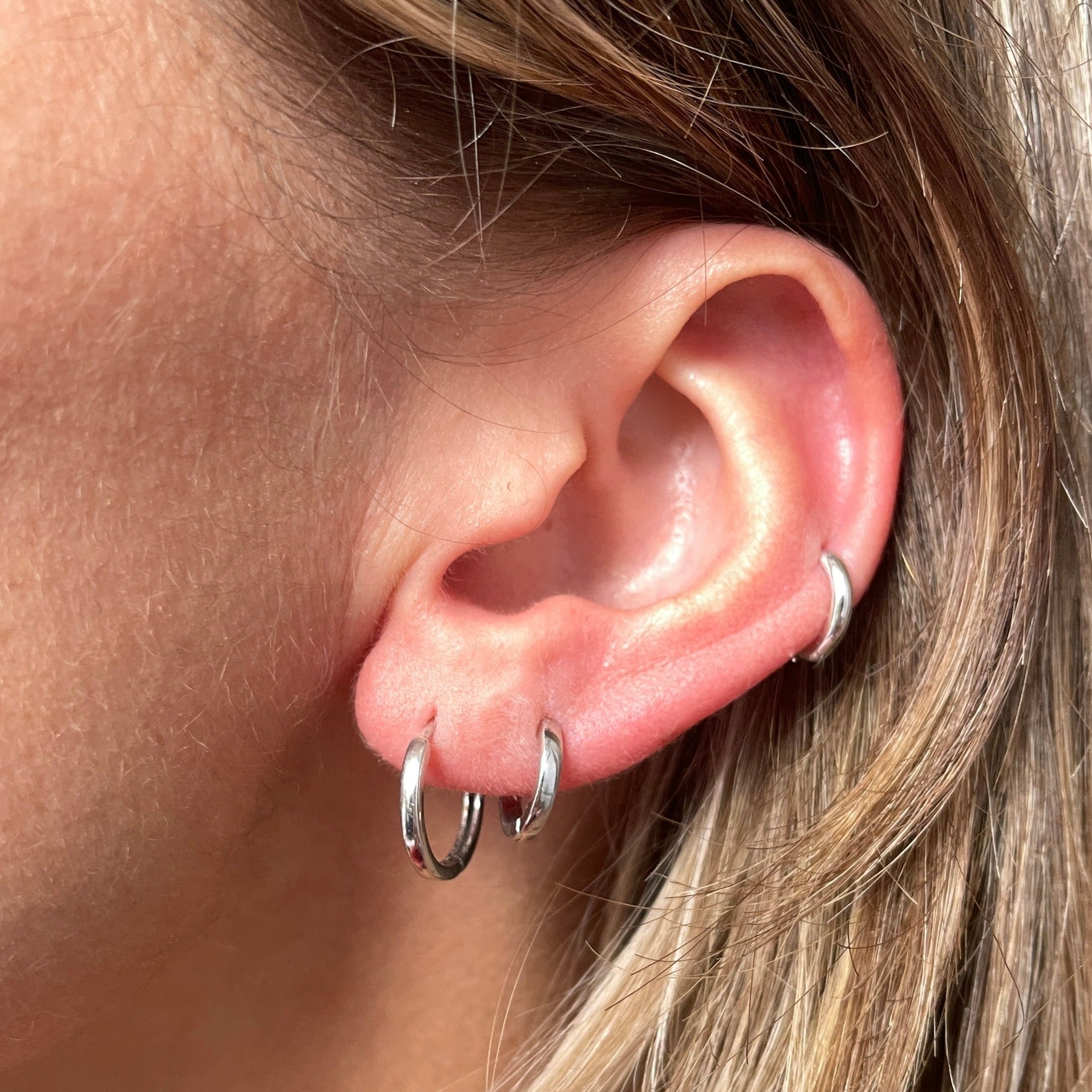 The Huggie Hoop measures 10.5mm outside edge to outside edge, with an 8mm internal diameter. The hoop with is 1.7mm. The post thickness is 0.8mm and 20 gauge. This huggie is perfect for Lobes but can also be worn in your Rook, Helix or in your Tragus.