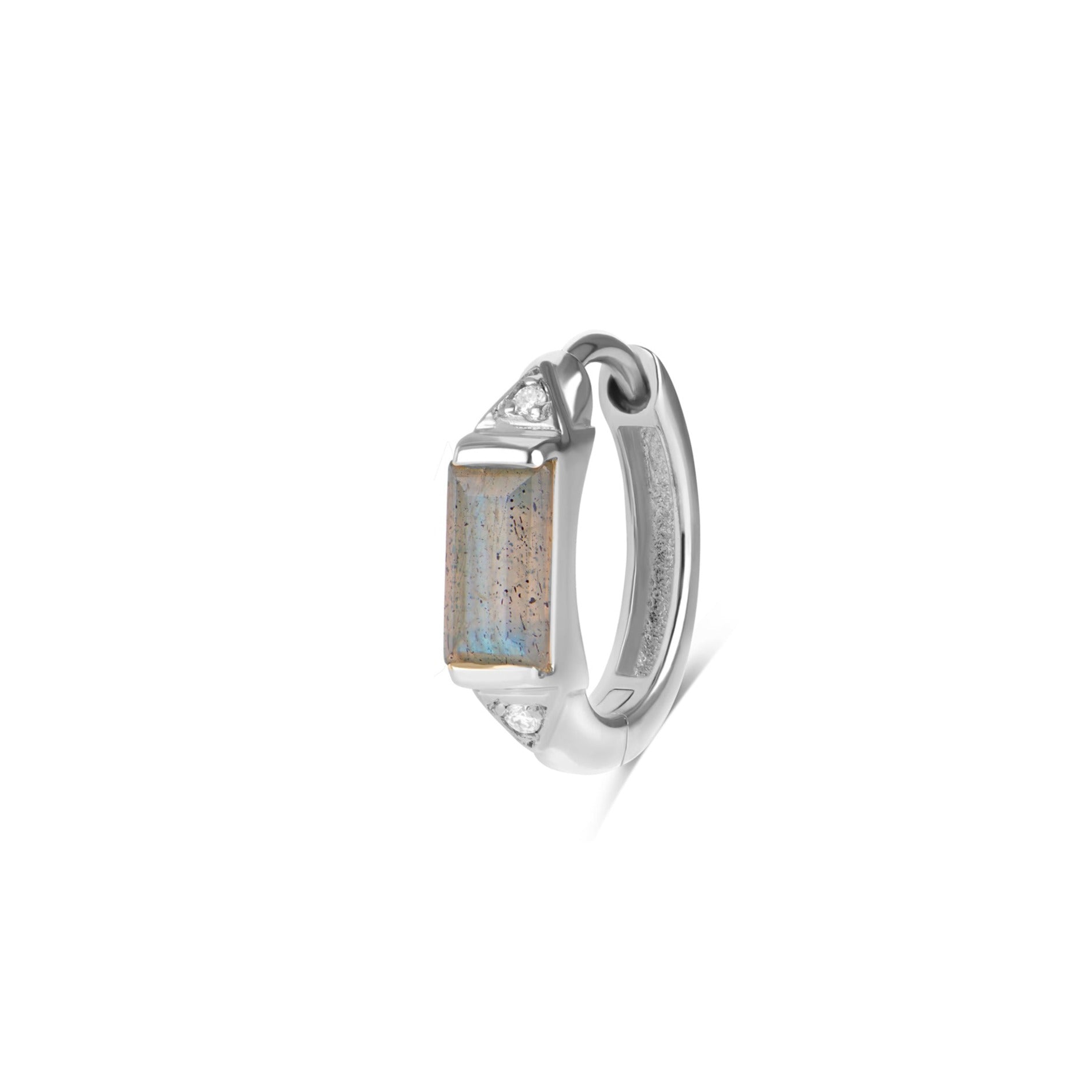 The iridescent hues of labradorite, on this huggie reminiscent of the night sky, complement the brilliance and sparkle of the white sapphires. Made in solid sterling silver.