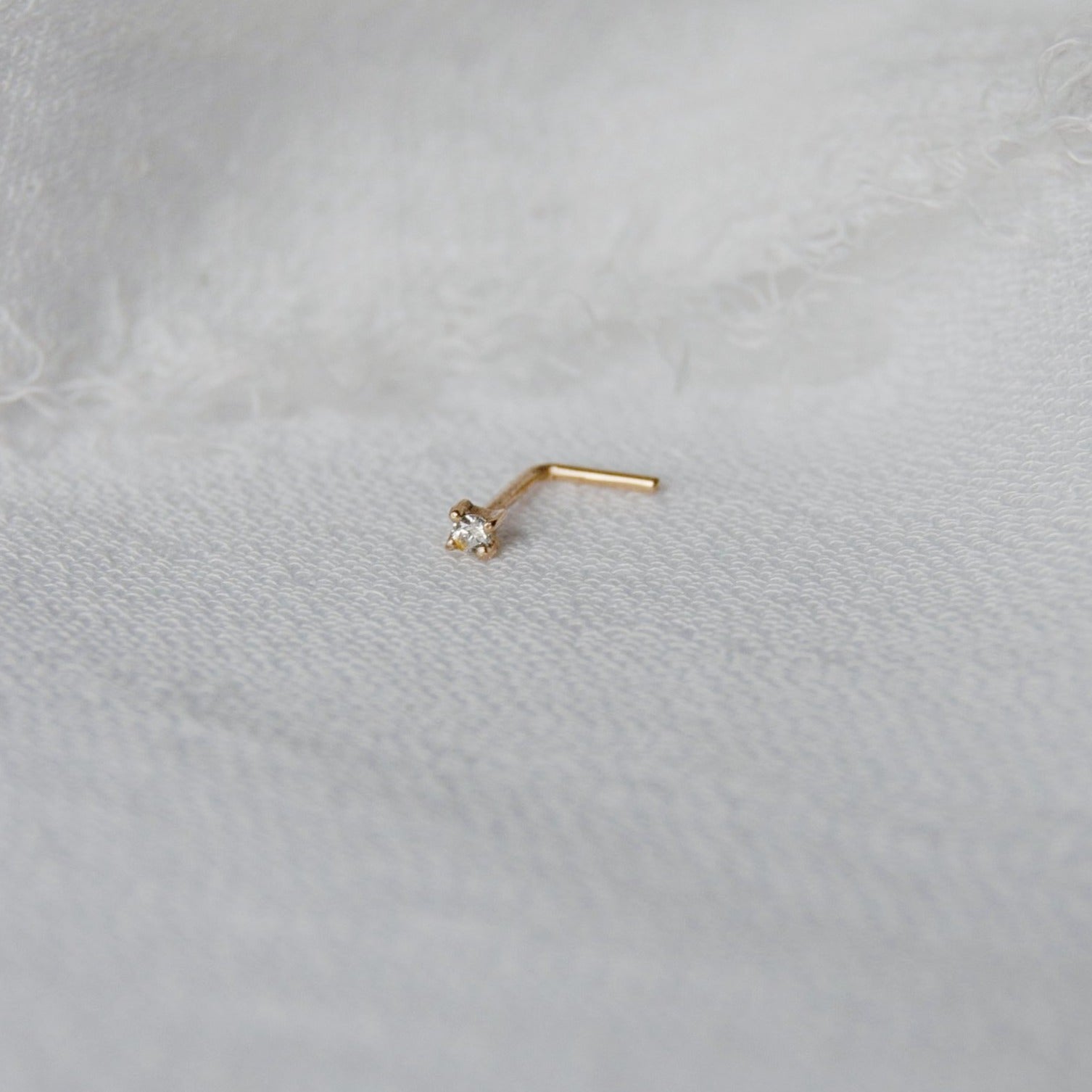 This delicate nose stud features an ethically sourced white diamond for a touch of sparkle. Crafted in solid 9k yellow gold, it's perfect for everyday wear.