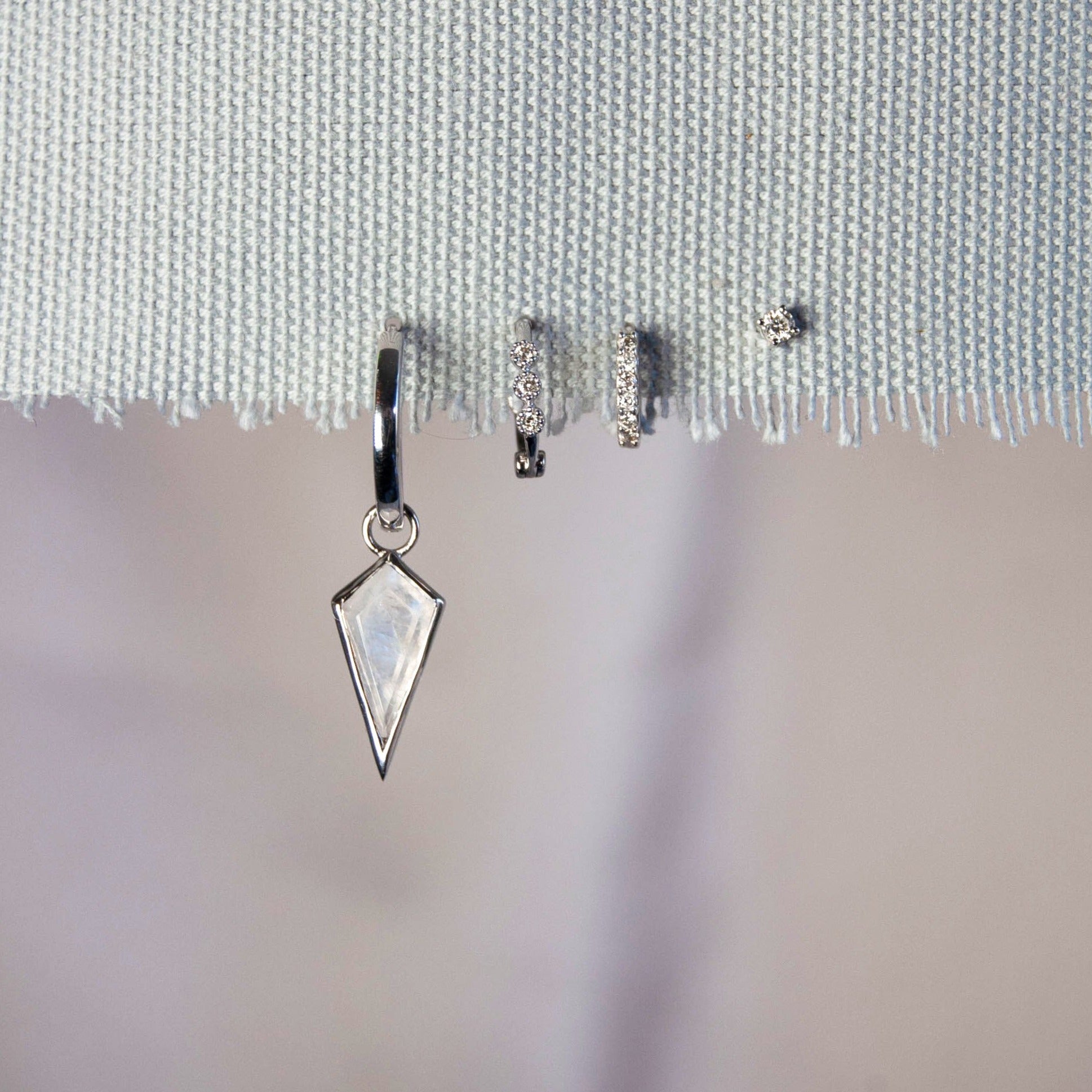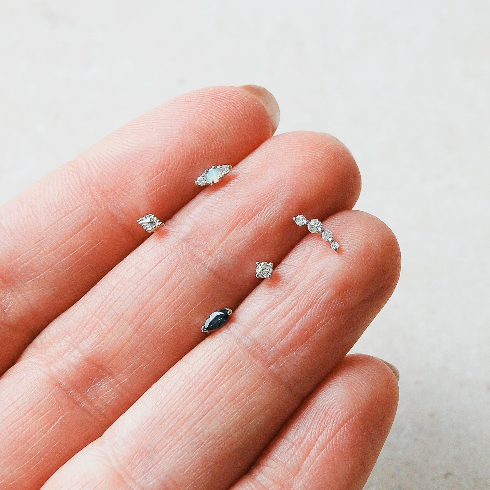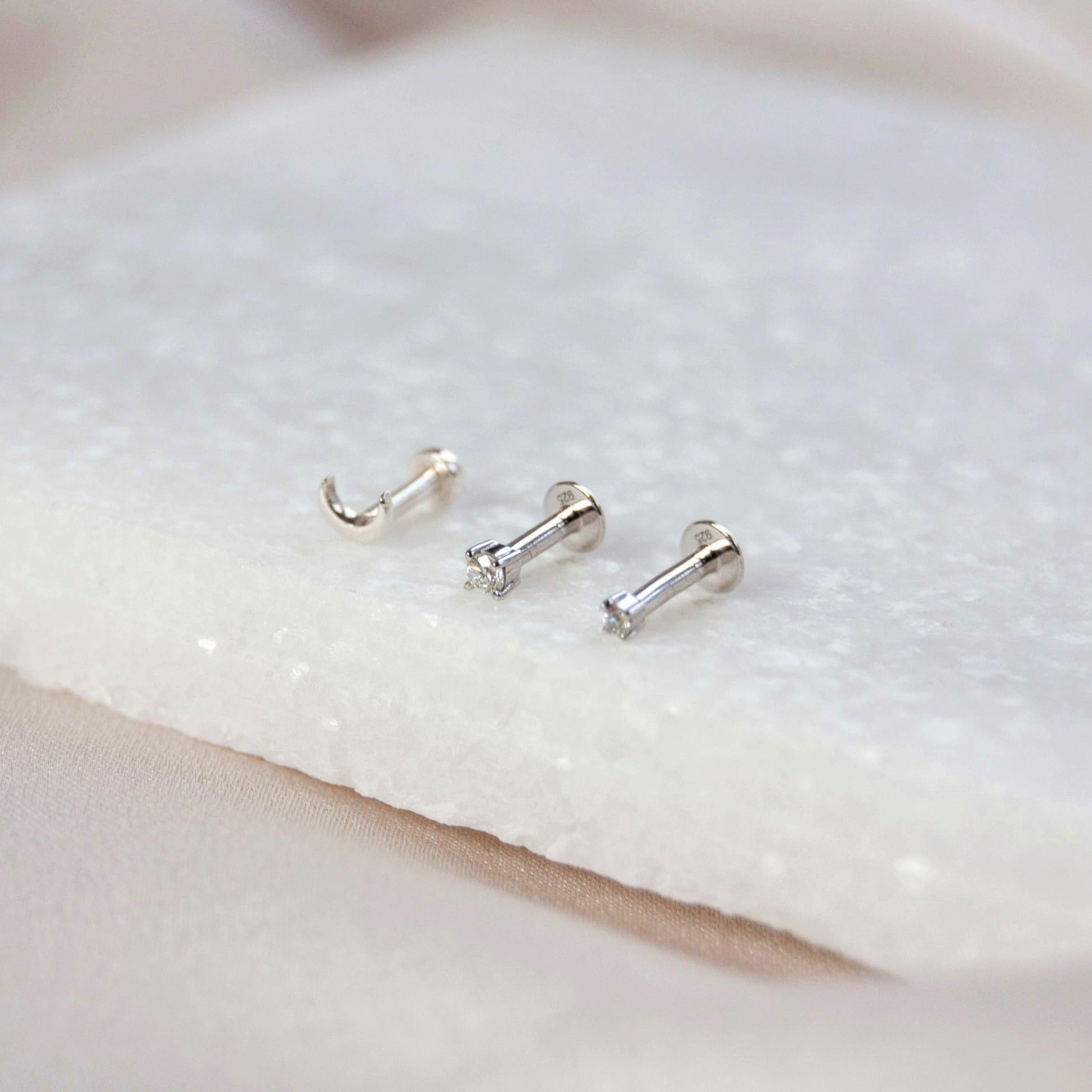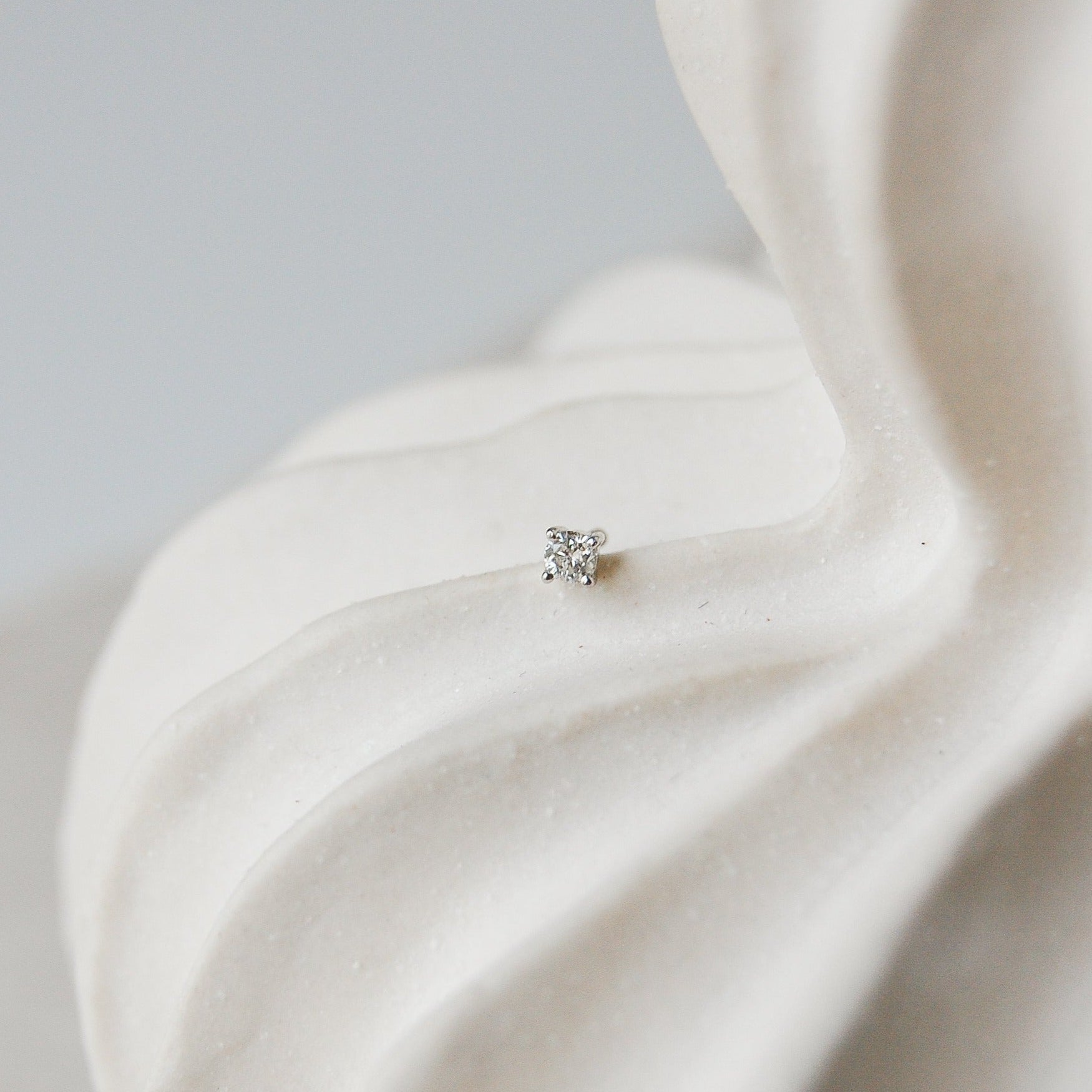 Add a touch of sparkle to your outfit with this elegant Diamond Solitaire Flat Back which looks gorgeous in any piercing! In Solid 14K White Gold. Why not try stacking all three sizes of our diamond solitaire flat back.