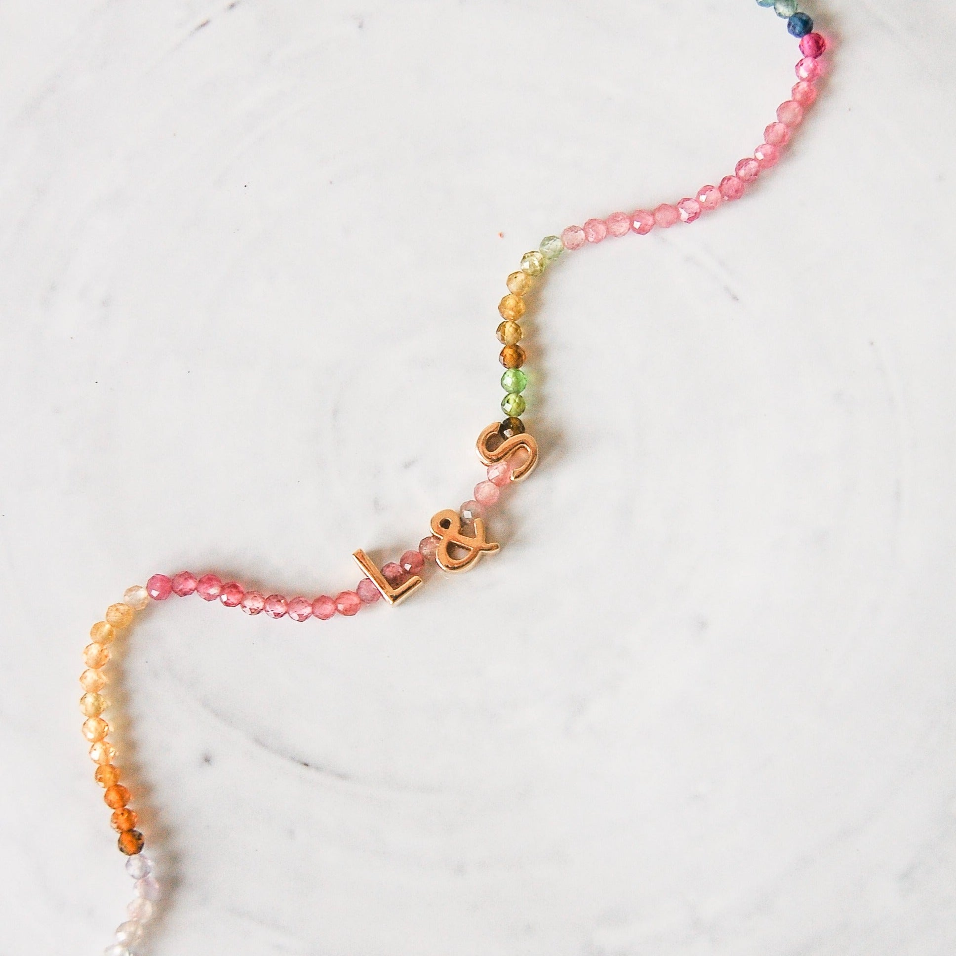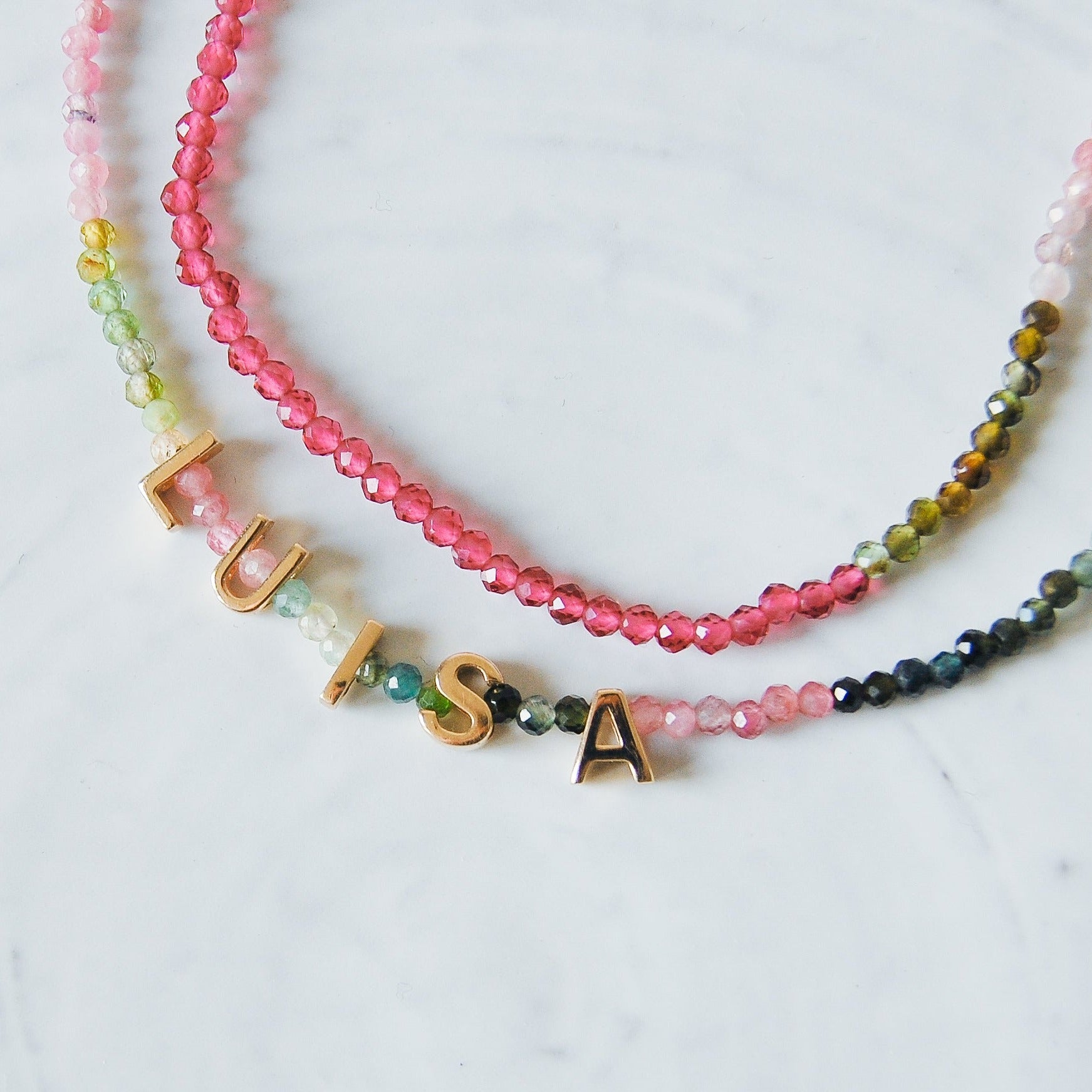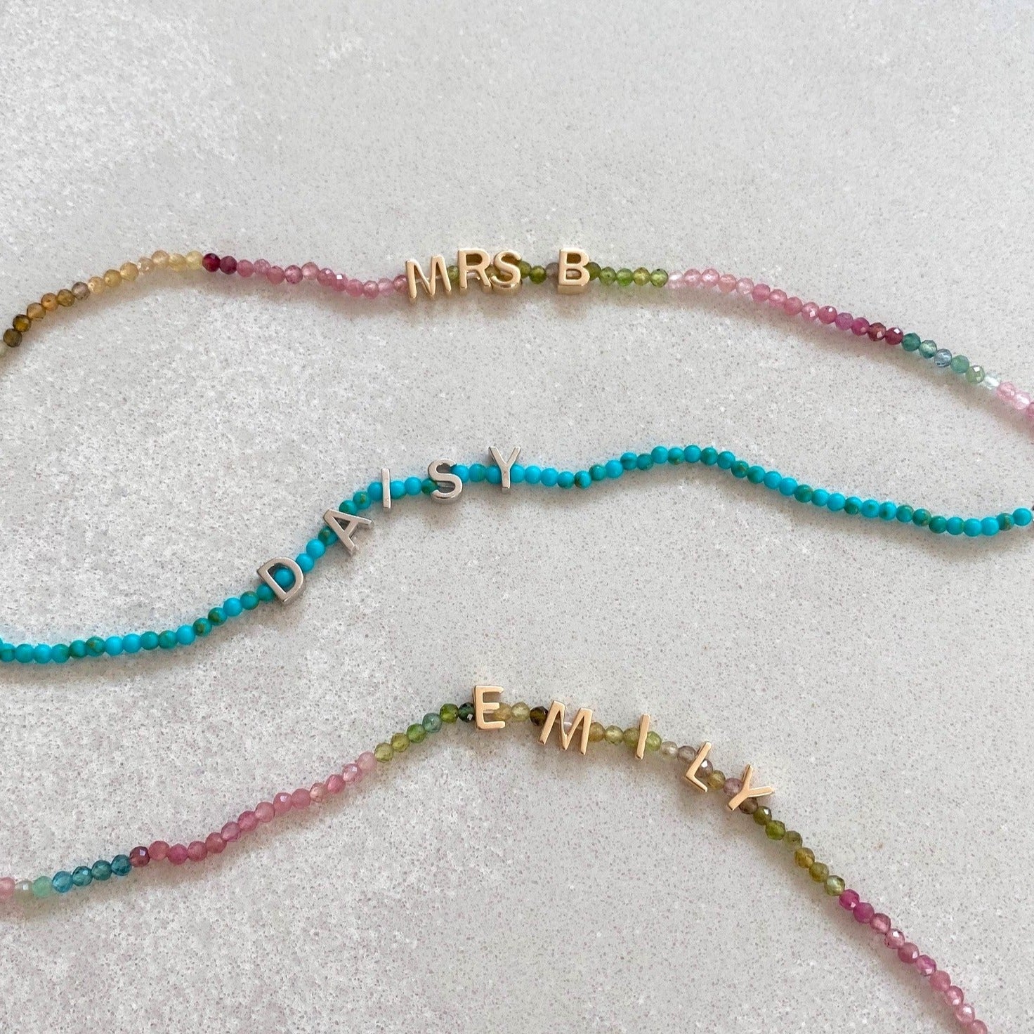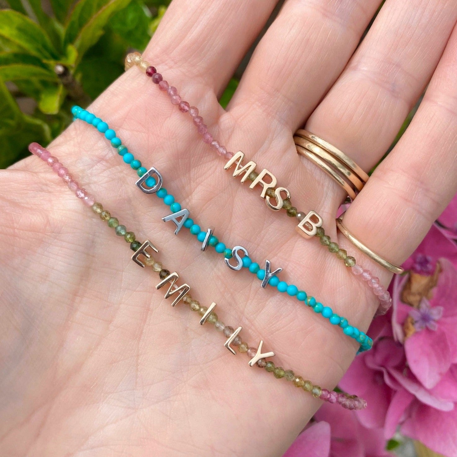 Create your own personal piece of jewellery. Choose beads from Watermelon Tourmaline, Amazonite, Turquoise, Pink Quartz or orange carnelian, and personalise with up to five solid 9k gold letters. Create a unique piece with initials, symbols names, or meaningful words to wear every day.