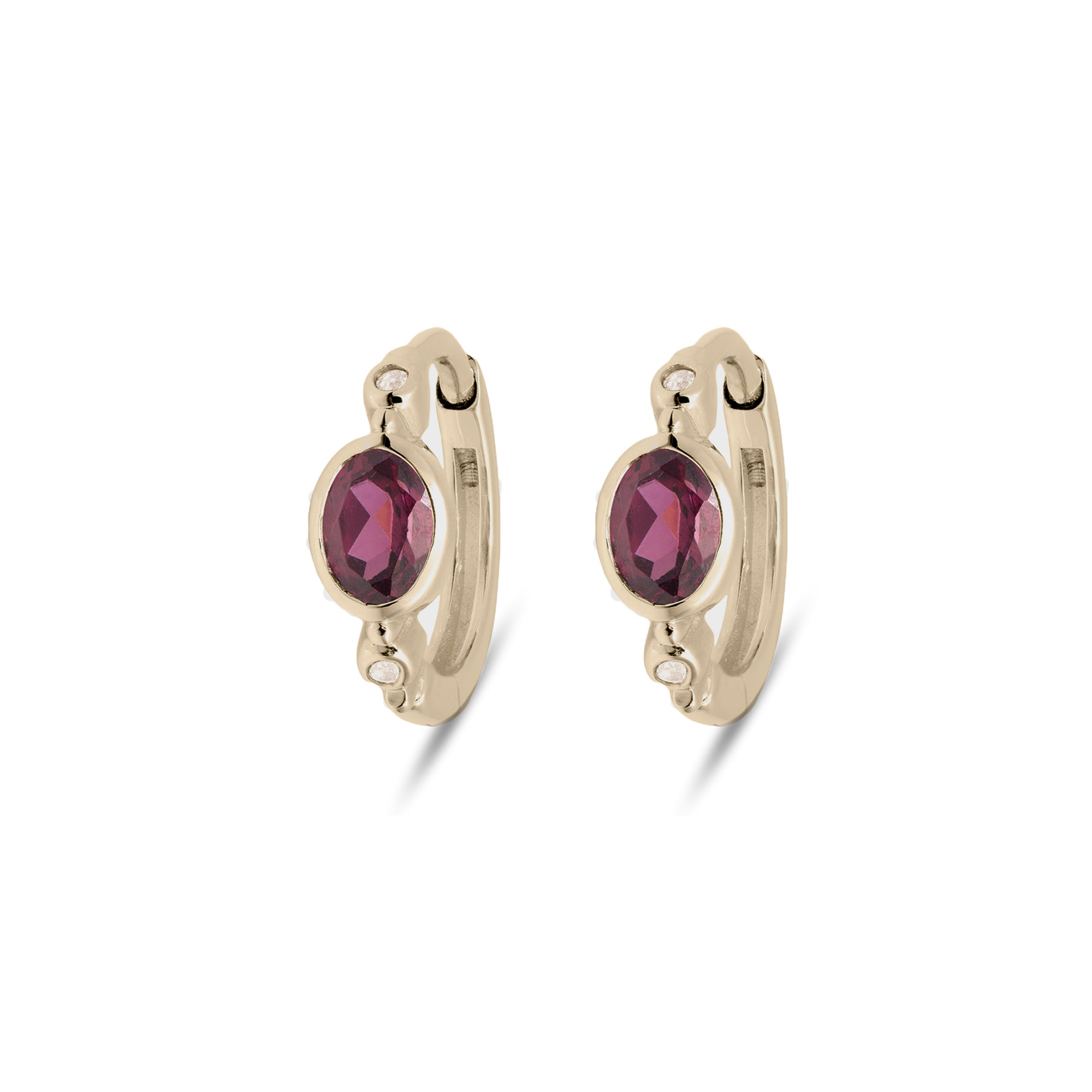 These chic Huggie Hoop Earrings are made in recycled 9k Solid Gold and showcase a beautiful Rhodolite Garnet stone alongside dazzling White Sapphires. The striking contrast between these special stones adds a luxurious touch, perfect for elevating any outfit. These earrings are versatile enough for both everyday wear and special occasions.