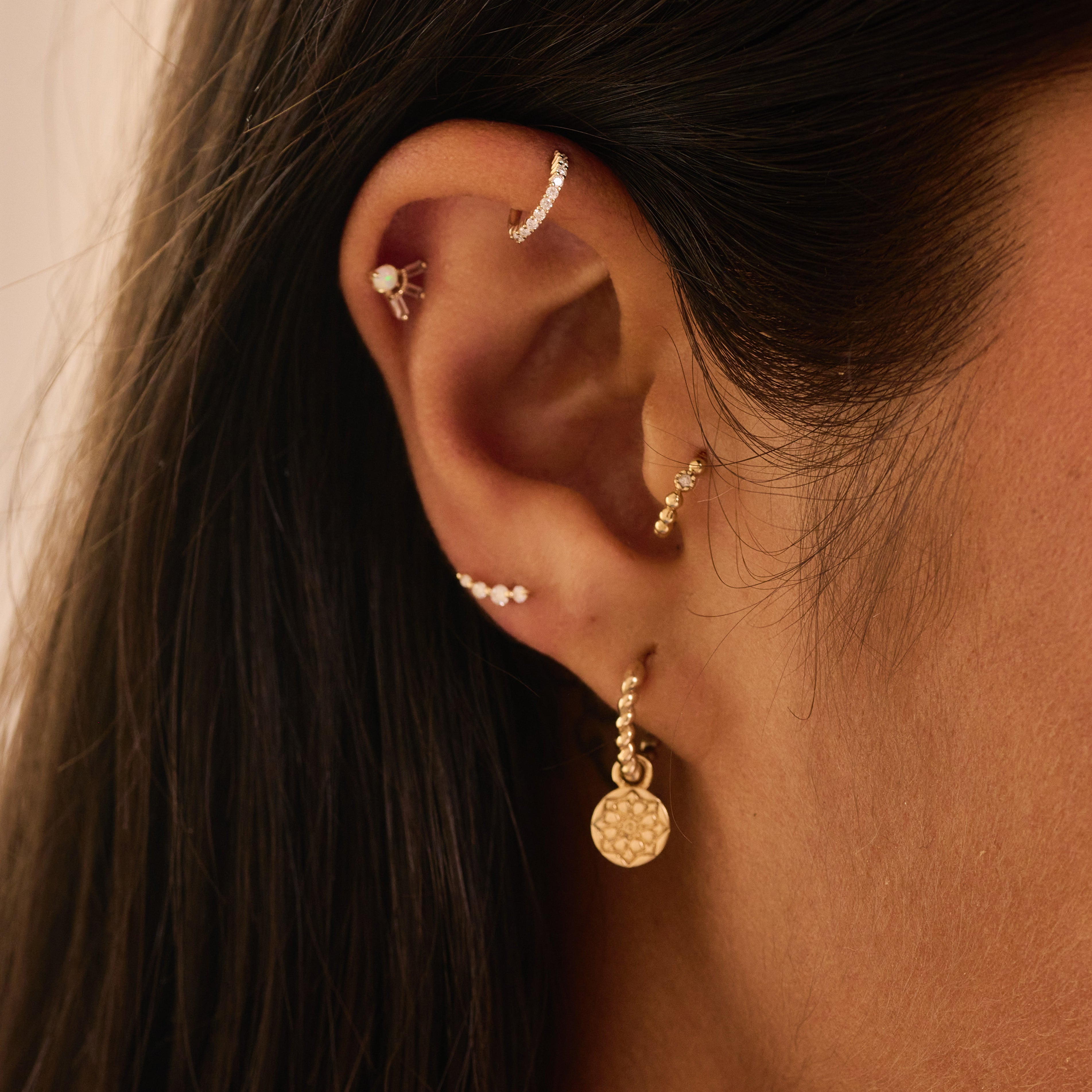 Elegant and timeless, the Zohreh Coin Hoop Earrings in solid 9k Gold are unique to our brand. Featuring a delicate coin engraved with the Zohreh V. icon, symbolising femininity, elegance, and grace. A perfect mix of modern and classic, ideal for any occasion.