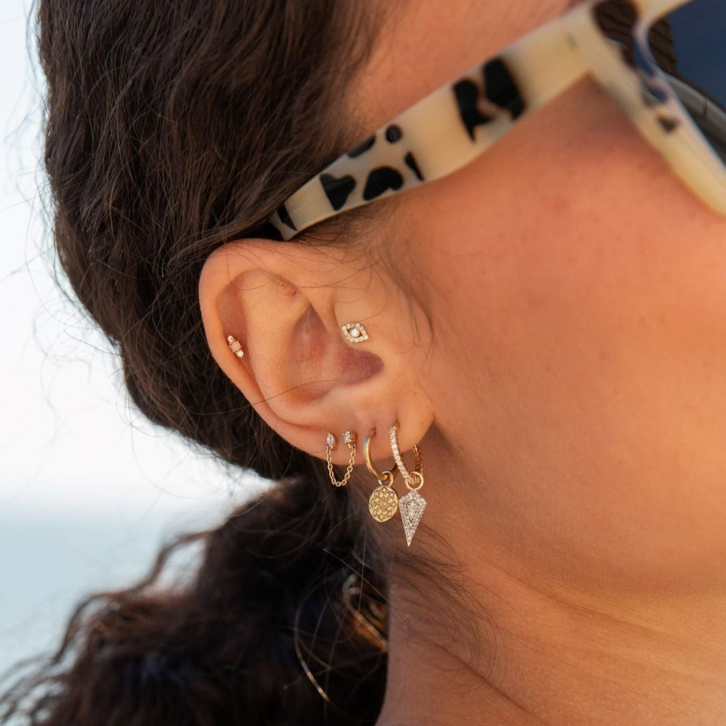 The Huggie Hoop measures 10.5mm outside edge to outside edge, with an 8mm internal diameter. The hoop width is 1.7mm. The post thickness is 0.8mm and 20 gauge.