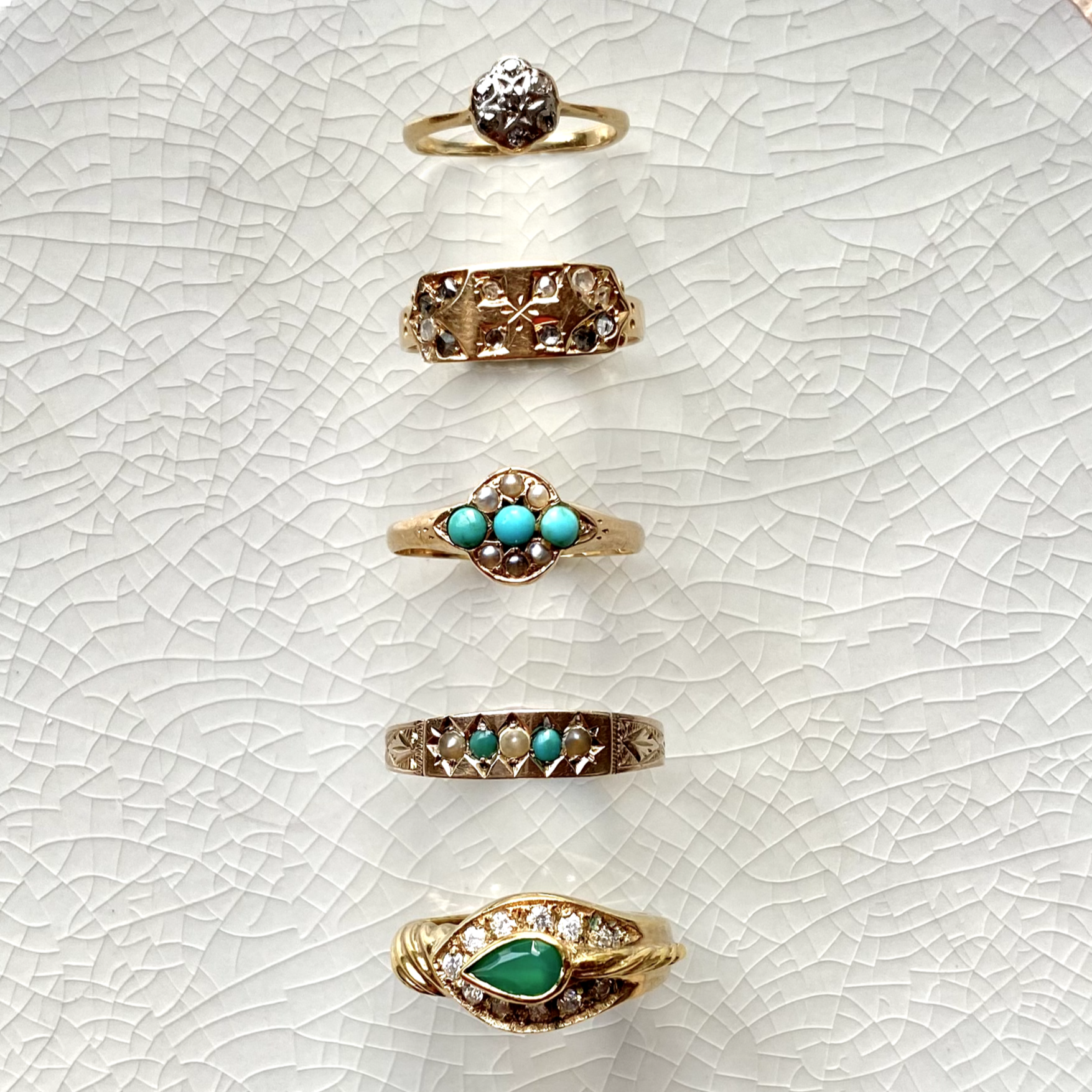 solid gold vintage rings displayed on tile, including the 15 kt Gold Salt & Pepper Diamond Signet Vintage Ring