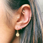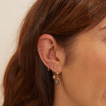 The Mini Diamond Trilogy Huggie contains three beautiful round cut ethically sourced diamonds in a super delicate solid 9 karat yellow gold hinge hoop. It is a perfect stacker item for multiple piercings, including your helix, tragus and mini lobes .