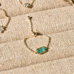 We are super excited about this elegant and effortlessly stylish piece. The Emerald Chain Ring made in recycled 9k Solid Gold features a stunning Emerald baguette and is designed with an adjustable chain, allowing you to wear it on different fingers for a super versatile look. The rich green hue of the emerald symbolises renewal, wisdom, and growth. The must have ring for everyone!