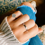 This gorgeous gold band will go with everything! Featuring this stunning hammered finish which is created by hand, this is a unique and special piece. It is also a beautiful option for a wedding band.