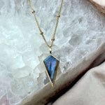Our signature Rhombus Pendant has been recreated with a stunning hand cut Labradorite stone. This is a truly beautiful, unique piece that you will not find anywhere else. Set in solid 9 karat yellow gold, you will never want to take it off! All our stones are ethically sourced and produced.