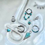 This hand-cut Turquoise spike charm, set in sterling silver, adds a bold pop of vibrant blue to any hoop. A striking statement for your curated ear, it’s perfect for standing out and adding a touch of colour to your look!