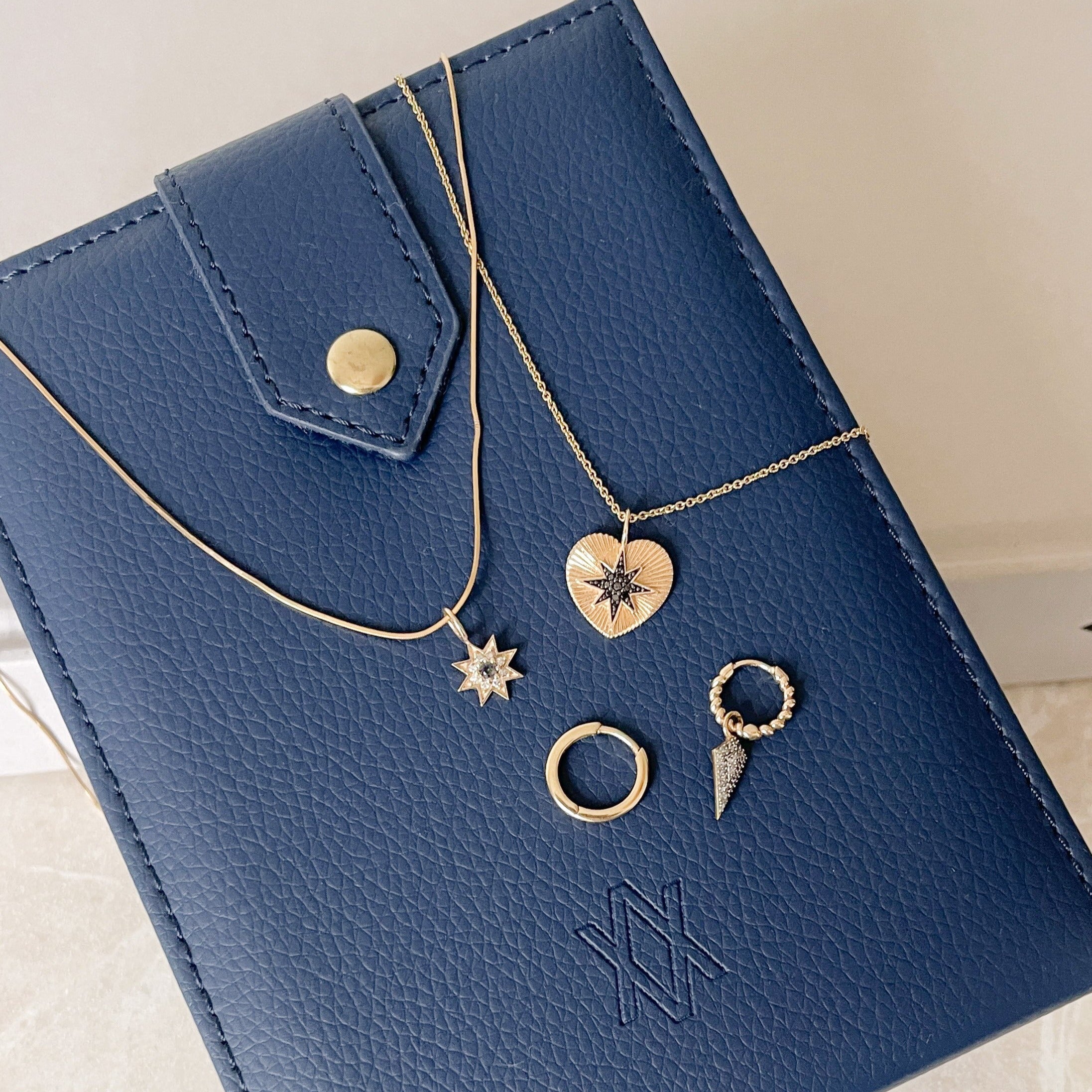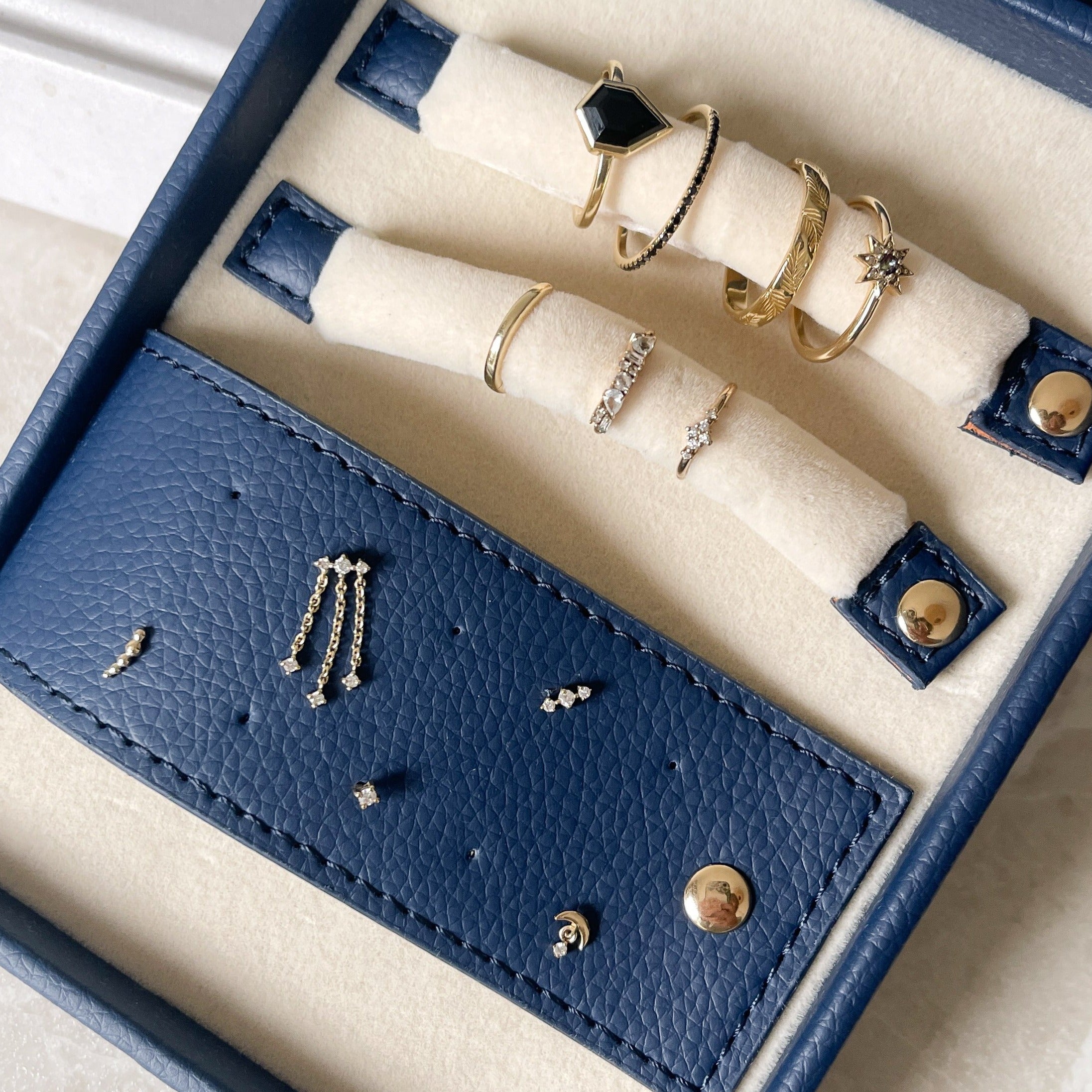 Keep your favourite jewels organised on those trips away with this beautiful Moritz jewellery box. Designed with plenty of organised storage for your whole collection. It has separate compartments for multiple sets of earrings, necklaces, and rings. The unique slanted angle hard-case design will fit discreetly and easily into your bag and keep all your jewellery protected.