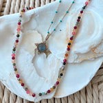 This necklace showcases all your favourite stones! Featuring pink and orange quartz, watermelon tourmaline, orange carnelian, and sterling silver beads, its natural beauty and vibrant colours are simply stunning.