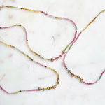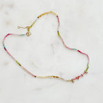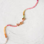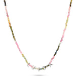 The Semi-Precious Beaded Name Necklace measures 15" in length with 2" extender chain so it can be worn at 15", 16" and 17". The letters & charms measure approx 5mm high.
