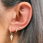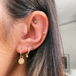 Super cute, this teeny trilogy flat back design is the perfect piece if you are looking for something subtle or have mini lobes! It is made in solid 14 karat yellow gold.