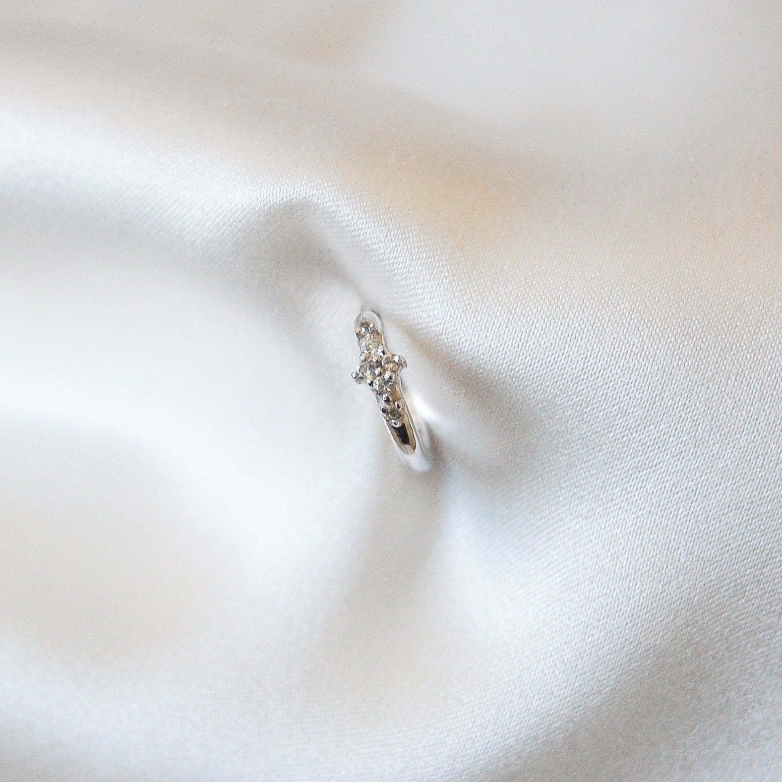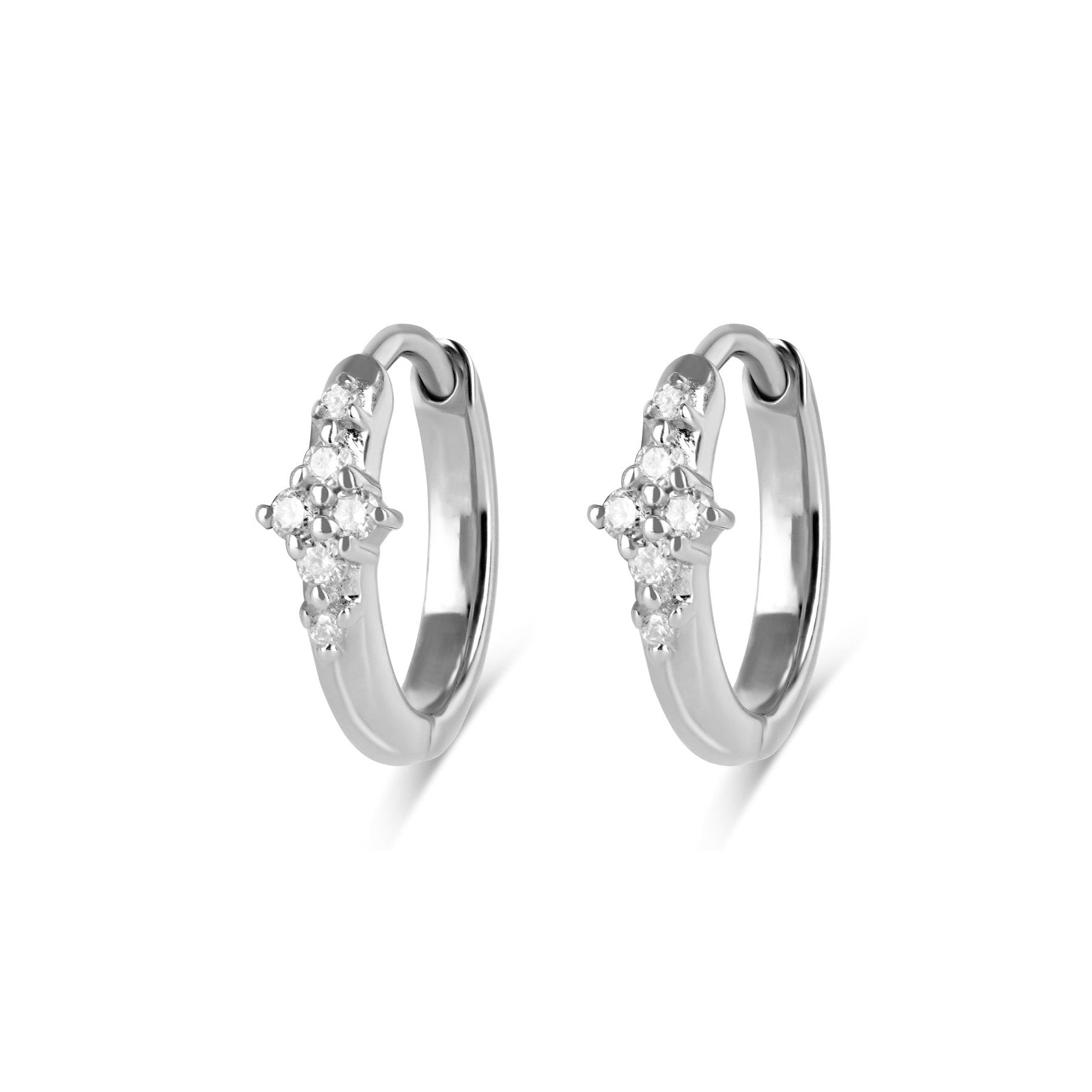 Clustered White Sapphire stones form the face of the huggies and it's modern design adds a trendy twist to the classic elegance of the white sapphire clusters.