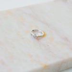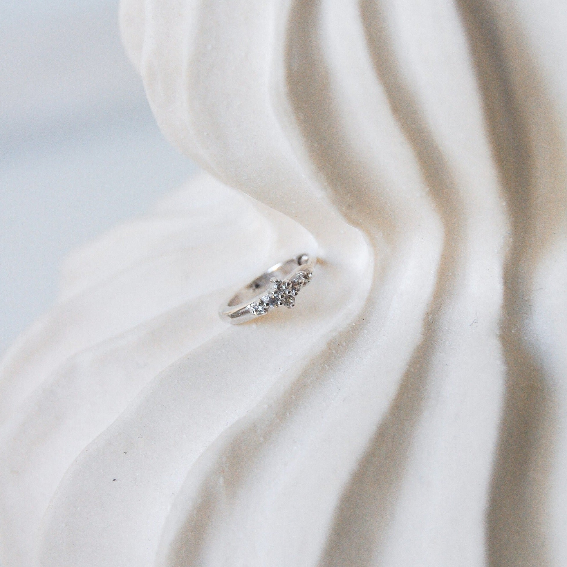 The White Sapphire Cluster Huggie Hoop measures 11.3mm outside edge to outside edge including the stone section, with a 8mm internal diameter and hoop width is 1.5mm and 3.2mm at its widest part. The post width is 0.6mm and 22 gauge.