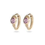 Add a touch of romantic elegance to your jewellery collection with our Boho-Inspired Huggie Hoop Earrings, crafted in solid recycled 9k gold. Each hoop is set with a beautiful pear-shaped pink sapphire, carefully chosen for its sophisticated colour and feminine charm. The gemstone is complemented by delicate beaded detailing, giving the hoops a textured, bohemian-inspired finish that feels both unique and timeless.