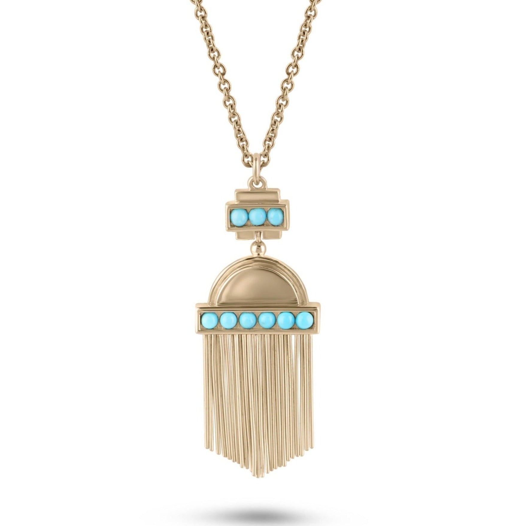 Inspired by the ancient Aztecs this solid gold pendant features stunning turquoise stones that add a vibrant pop of colour to any outfit. It's intricate design showcases the beauty of turquoise, making it a unique and meaningful accessory. Made from recycled solid 9k gold.
