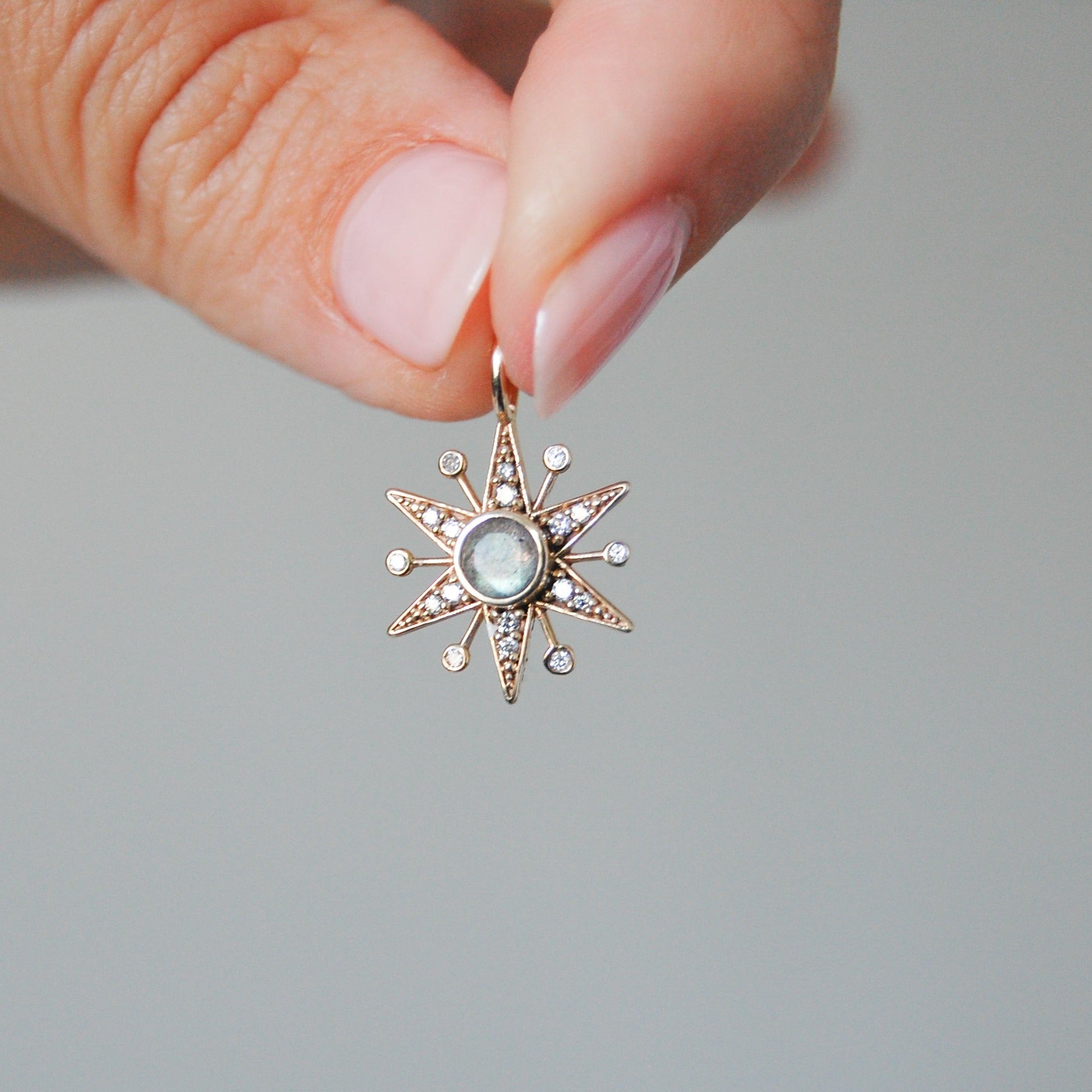 This beautiful, unique star necklace features a central iridescent labradorite surrounded by diamond-studded points and drops. Crafted in solid 9k yellow gold with ethically sourced stones, it's truly a special piece and a standout in any layered look.
