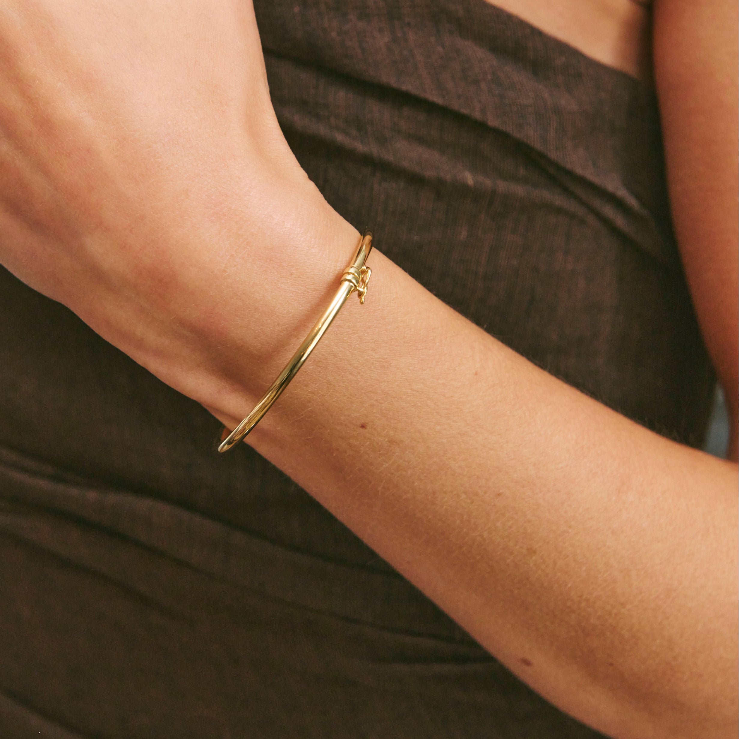 Handmade in solid recycled 9k yellow gold, this bangle has a clasp opening to easily slip on and off and looks stunning alone or layered with your other Zohreh favourites. Its minimalist design ensures it’s a versatile piece you’ll treasure for years to come.