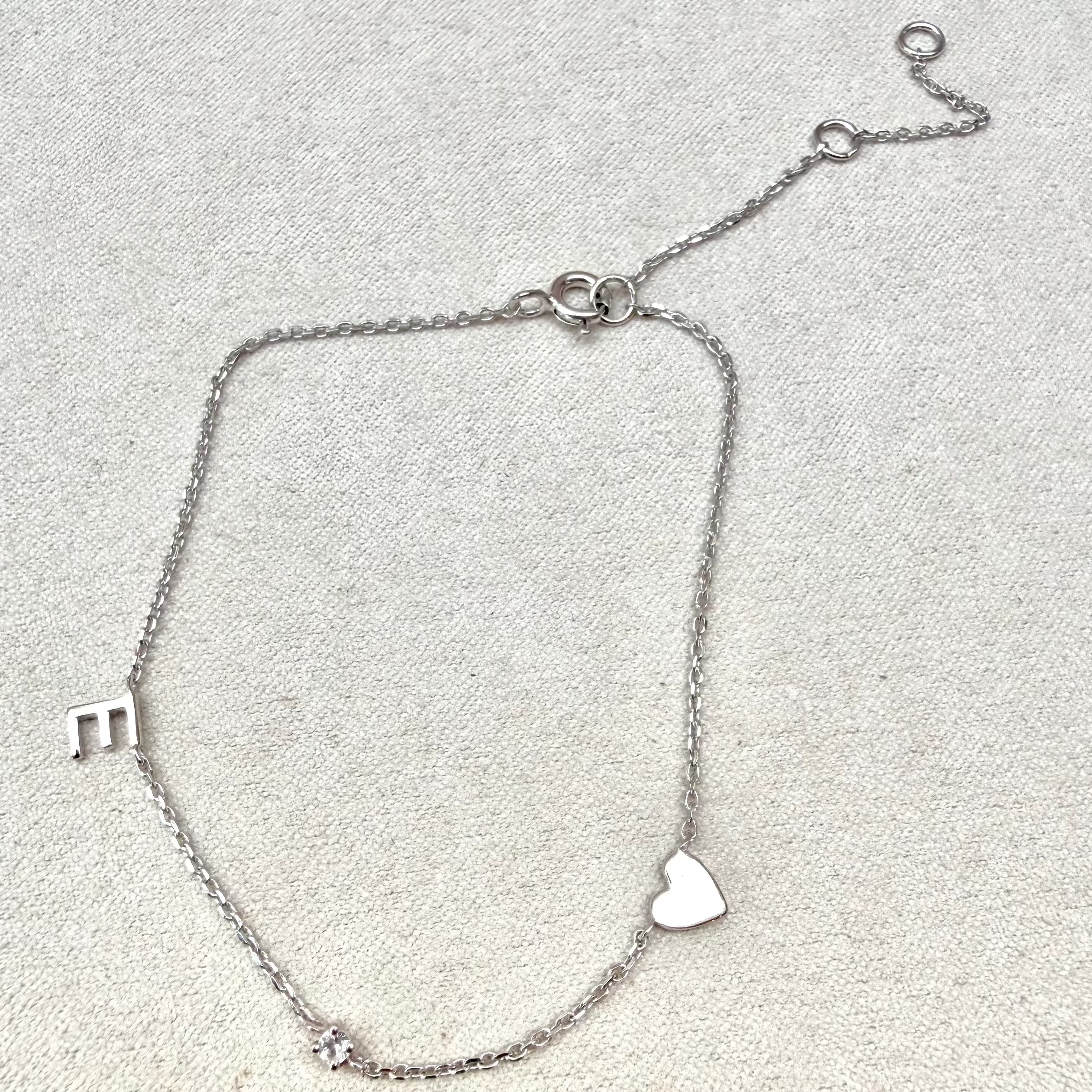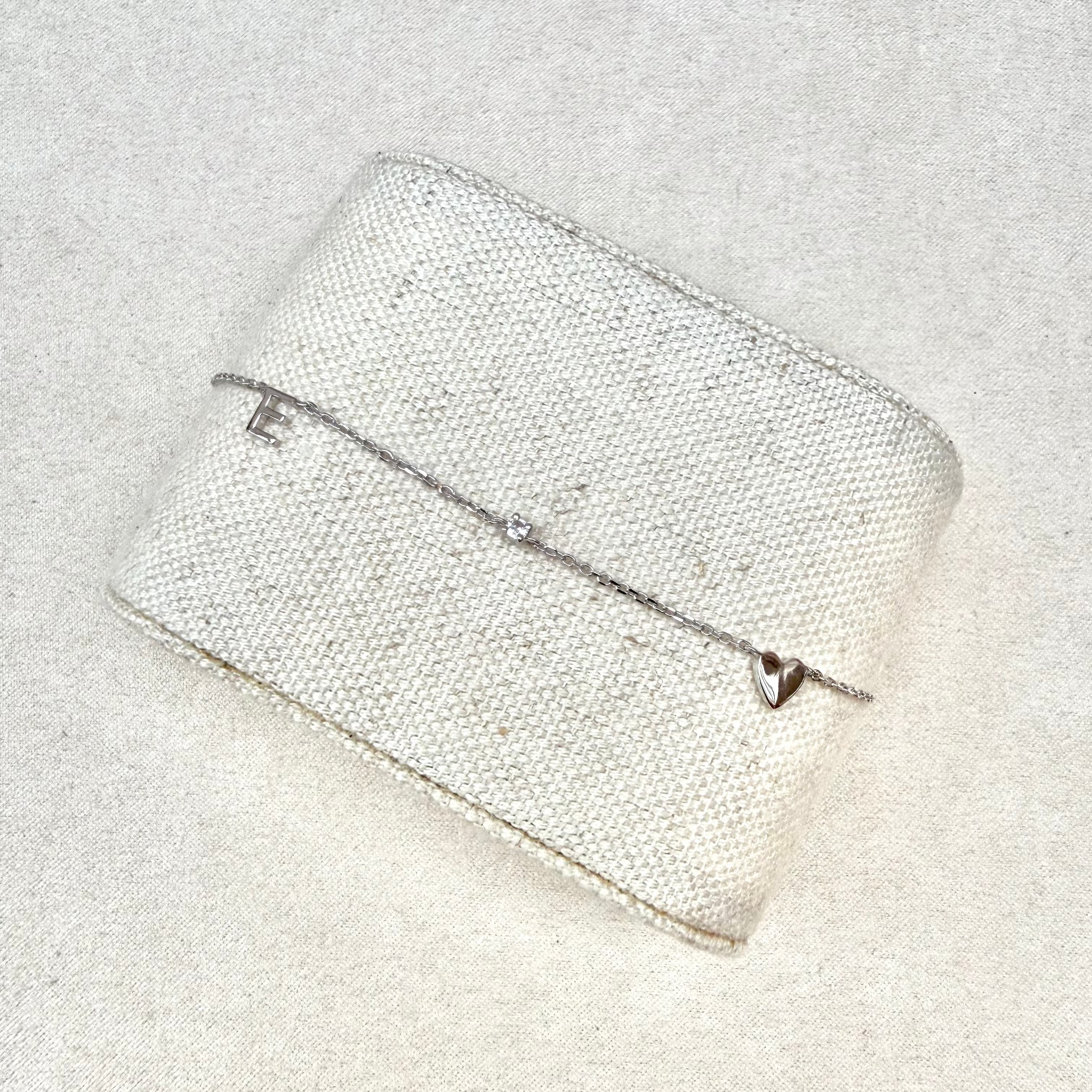 Letter E, heart and White Sapphire Bracelet Sterling Silver Sample