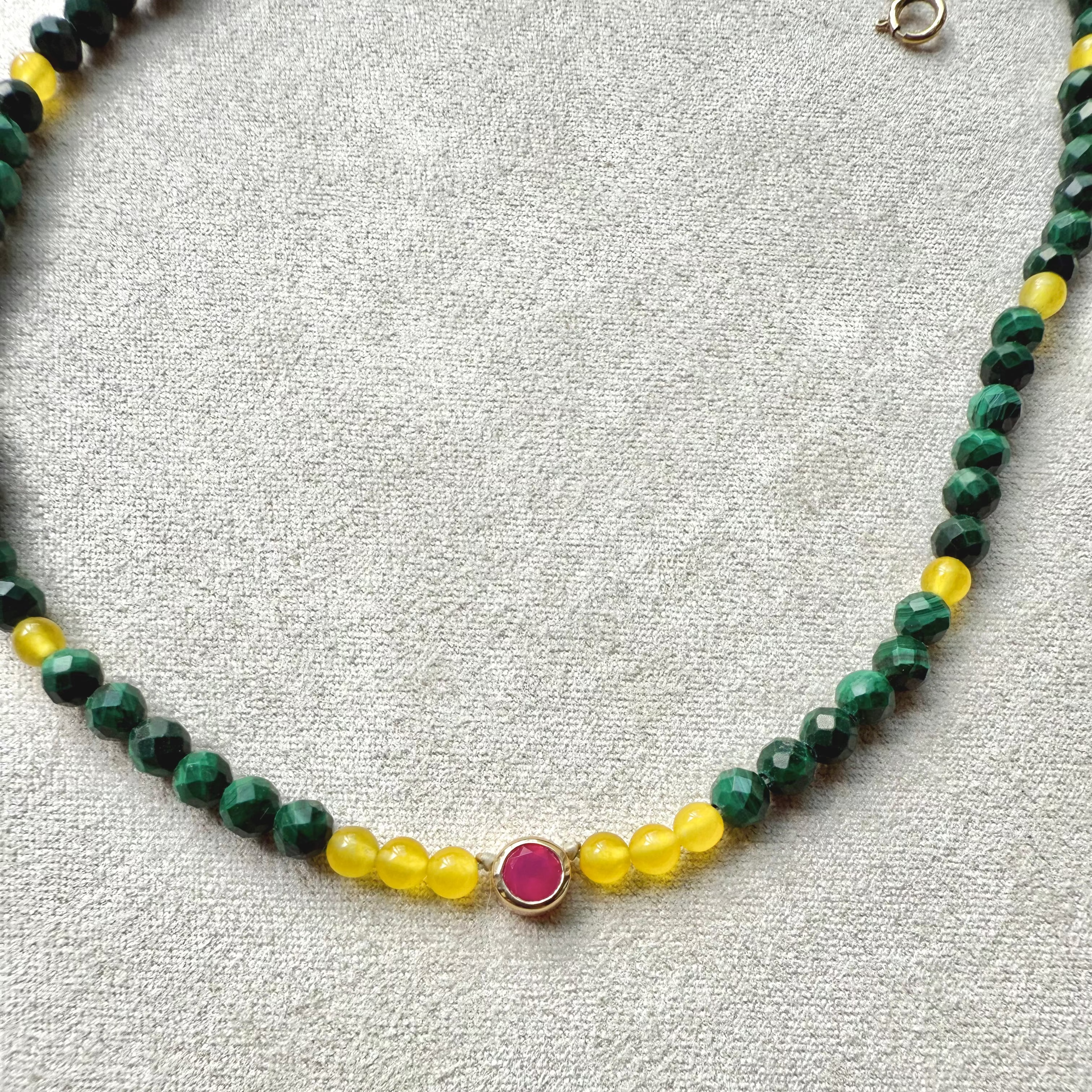 Malachite & citrine beads with pink quartz set in a solid gold casting.