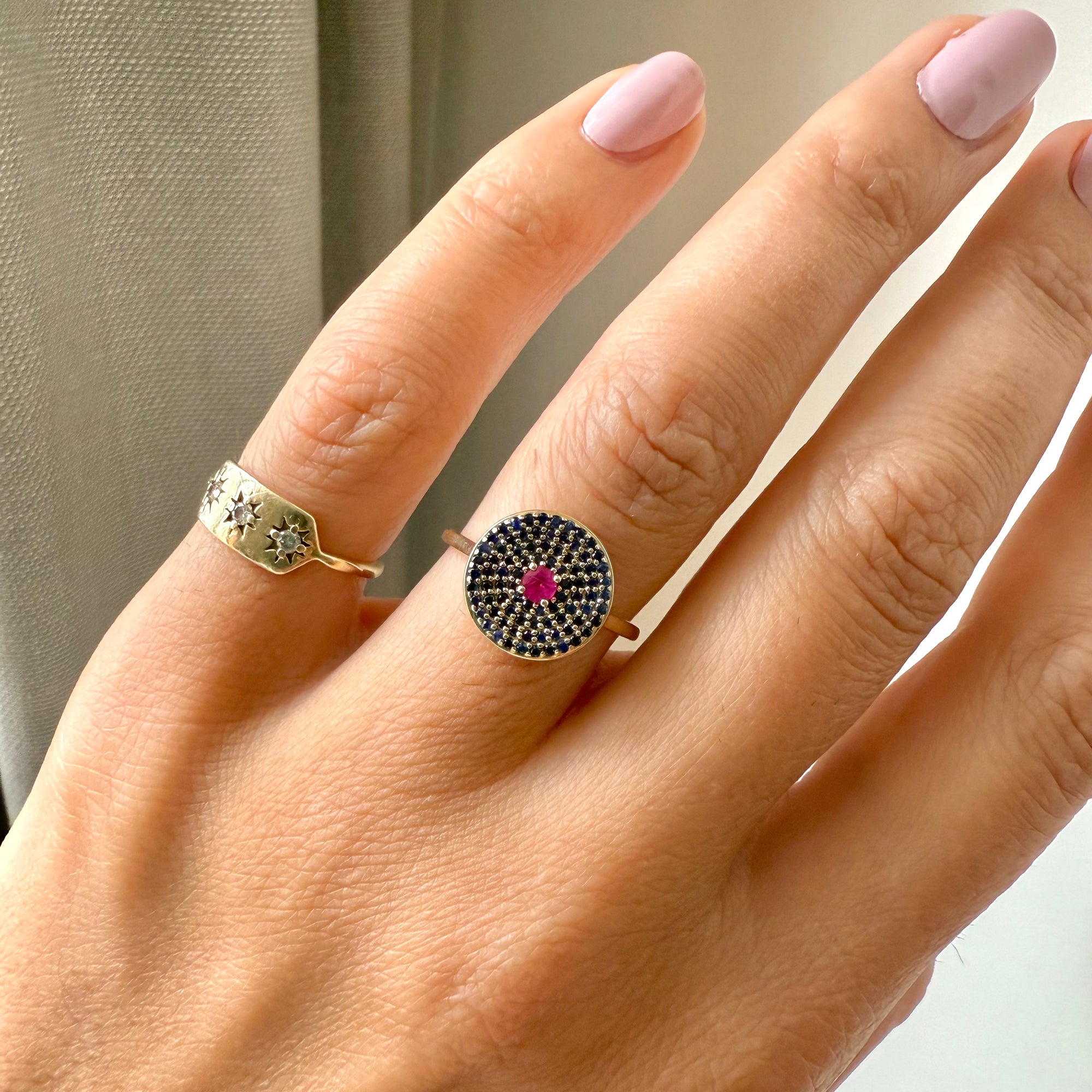 Bring a burst of colour and contemporary elegance to your jewellery collection with our Sapphire & Ruby Pavé Disc Ring. Handcrafted in solid recycled 9k white gold, this striking ring features a round disc pavé-set with 84 deep blue sapphires and fiery pink rubies, creating a dazzling contrast and vibrant sparkle.