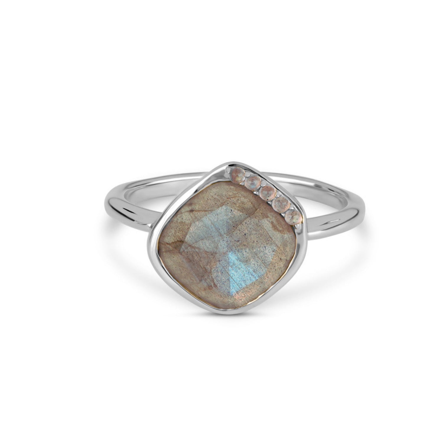 This stunning statement labradorite ring features incredible blue-to-green flashes. Set in a beautiful sterling silver organic band with 5 mini labradorite stones, we love the play of colours that dance across its surface as it catches the light.
