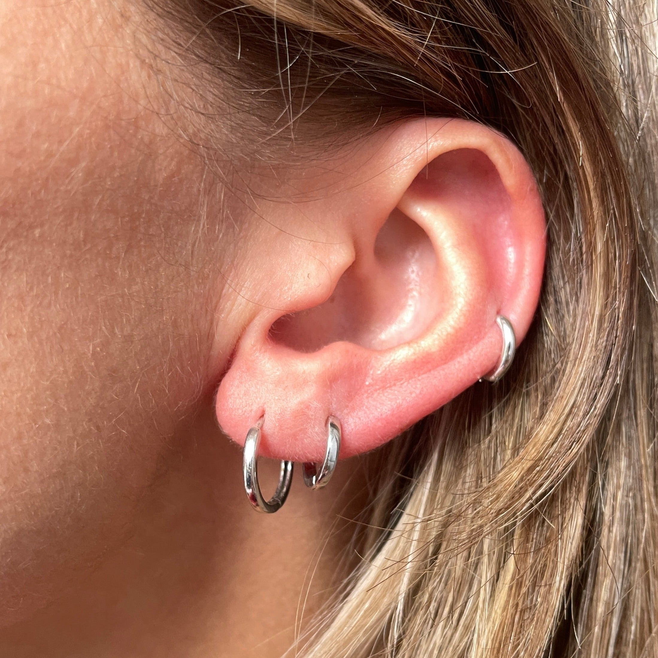 The Mini Huggie Hoop measures 9.5mm outside edge to outside edge, with a 7mm internal diameter. The width is 1.8mm. The post thickness is 0.9mm and 19 gauge.