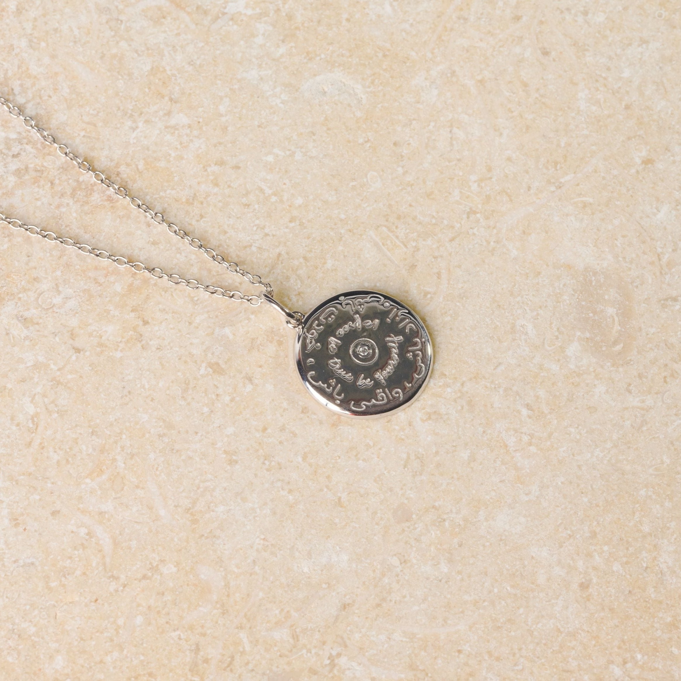 This sterling silver pendant was designed in memory of Zohreh V. founder Luisa’s friend Dillon. Engraved with ‘be free, be true, be yourself’ the saying reminded her of Dillon and is written in both English and Farsi signalling Luisa’s English/Persian heritage. It is set with a centre diamond to mark how precious Dillon was to her.