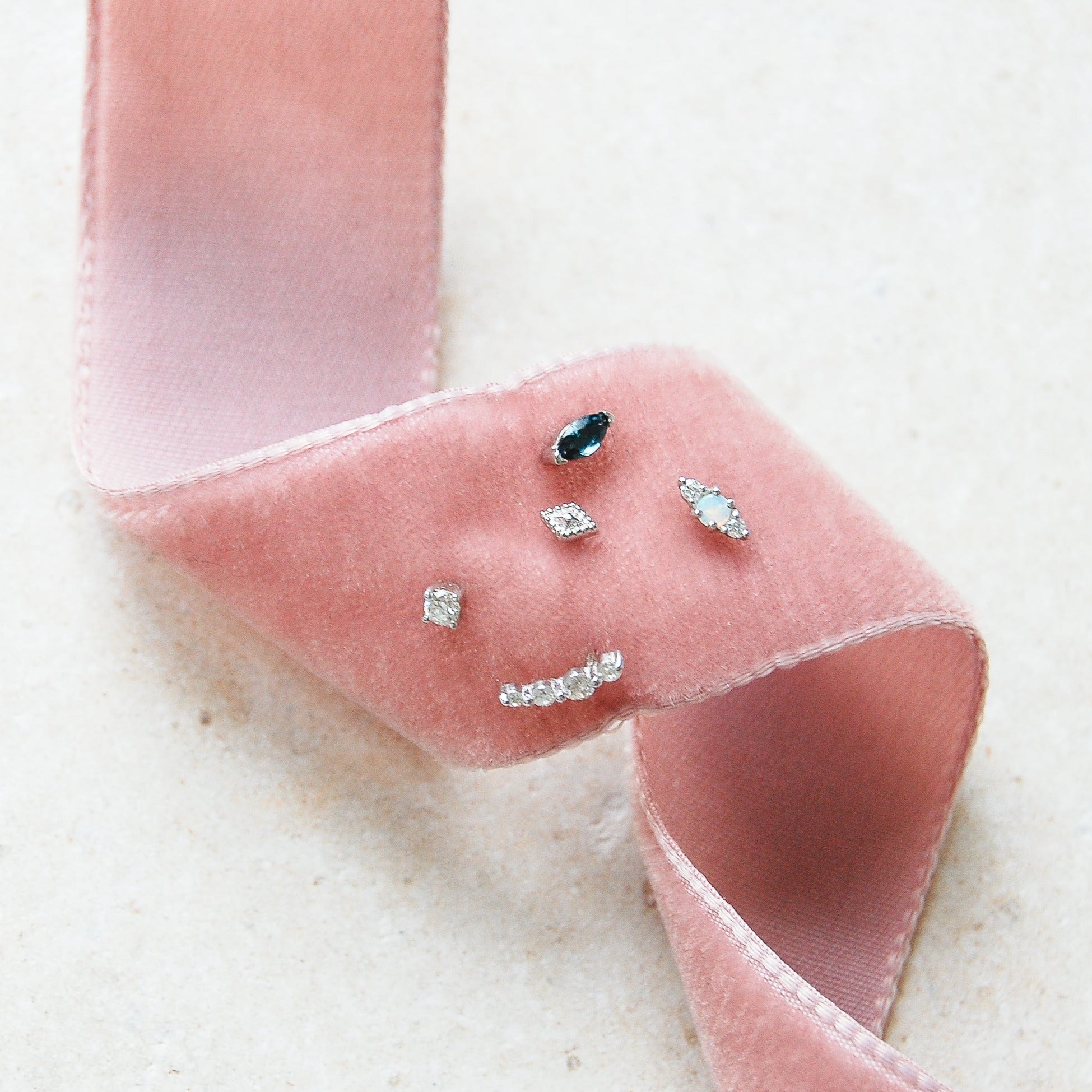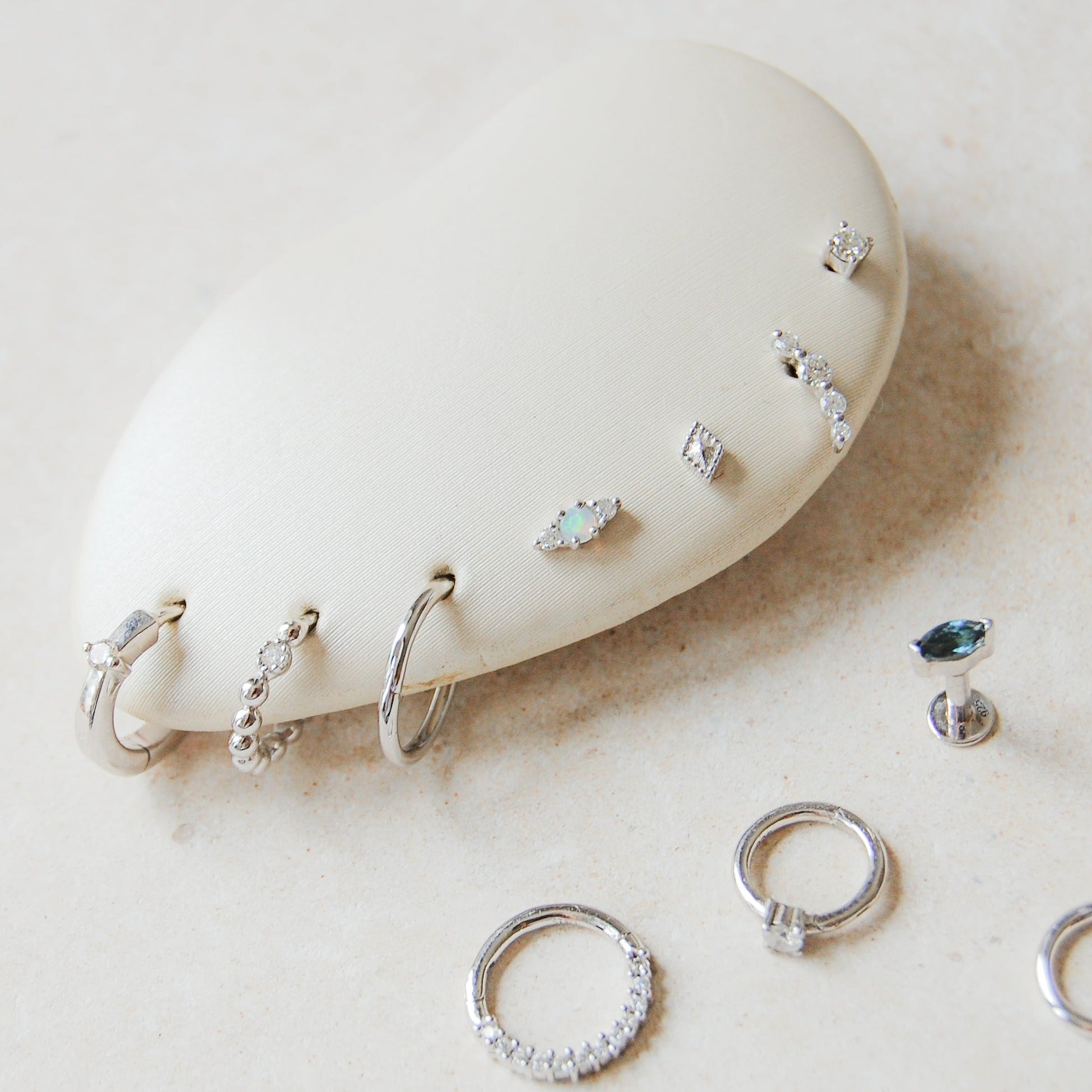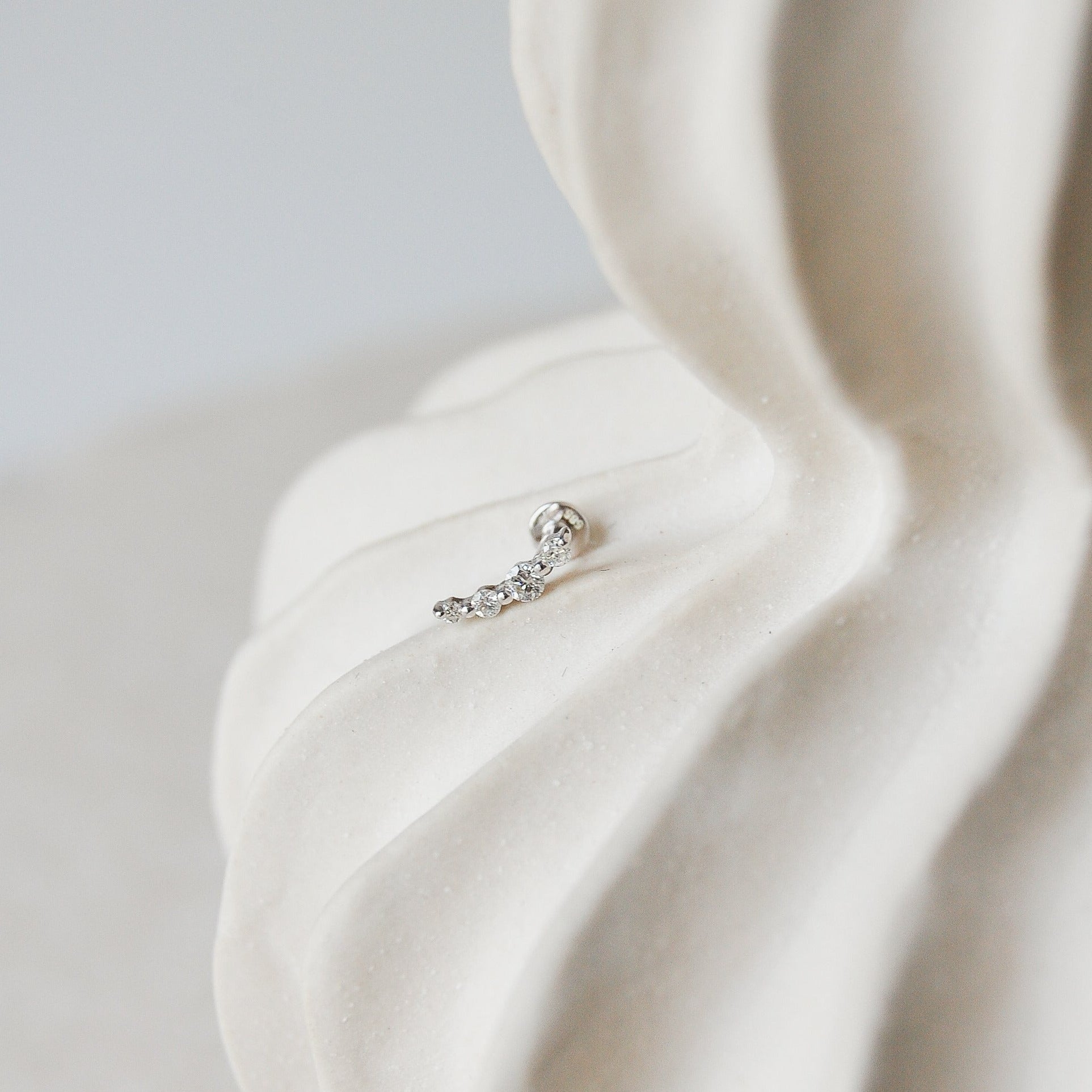 This piece is so special. The Graduated Diamond Curve Flat Back features luxurious diamonds that climb up the ear, connected by solid 14 karat white gold, in a design that elevates any existing piercings.