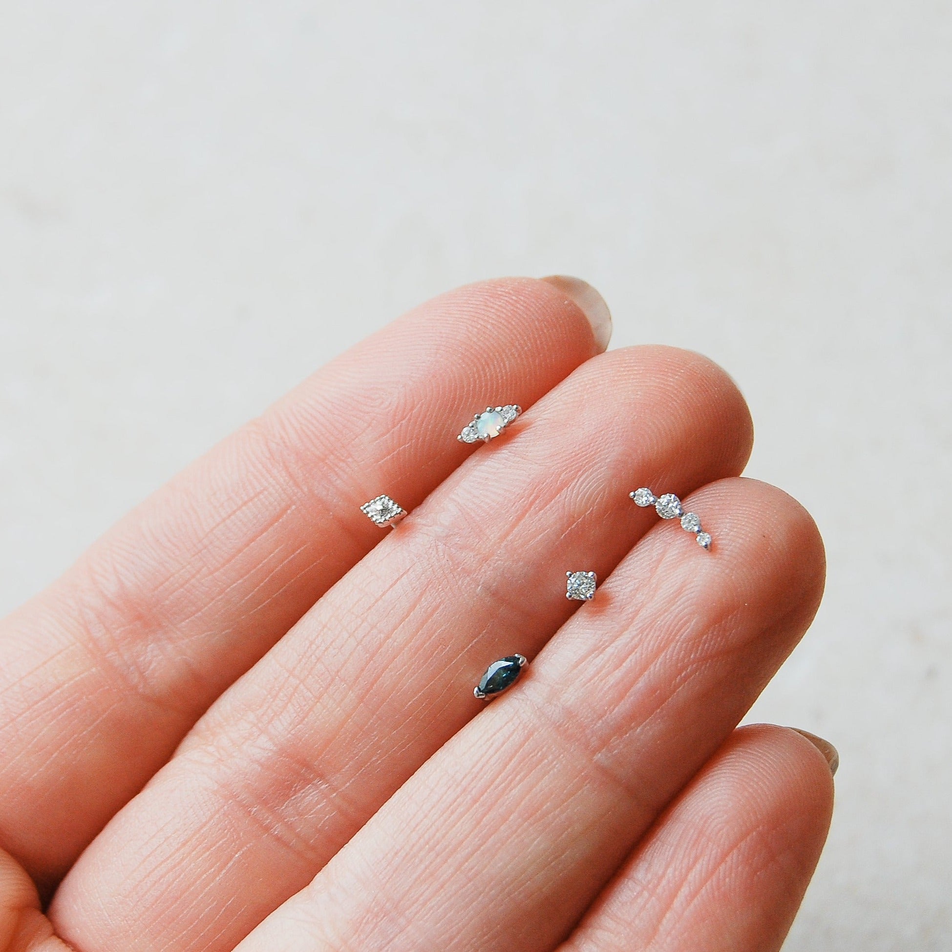 The Diamond Curve Flat Back measures 2 mm in height and 7.5 mm in width at the widest points. The post measures 1 mm and 18 gauge. The disc at the back is 3 mm in diameter.