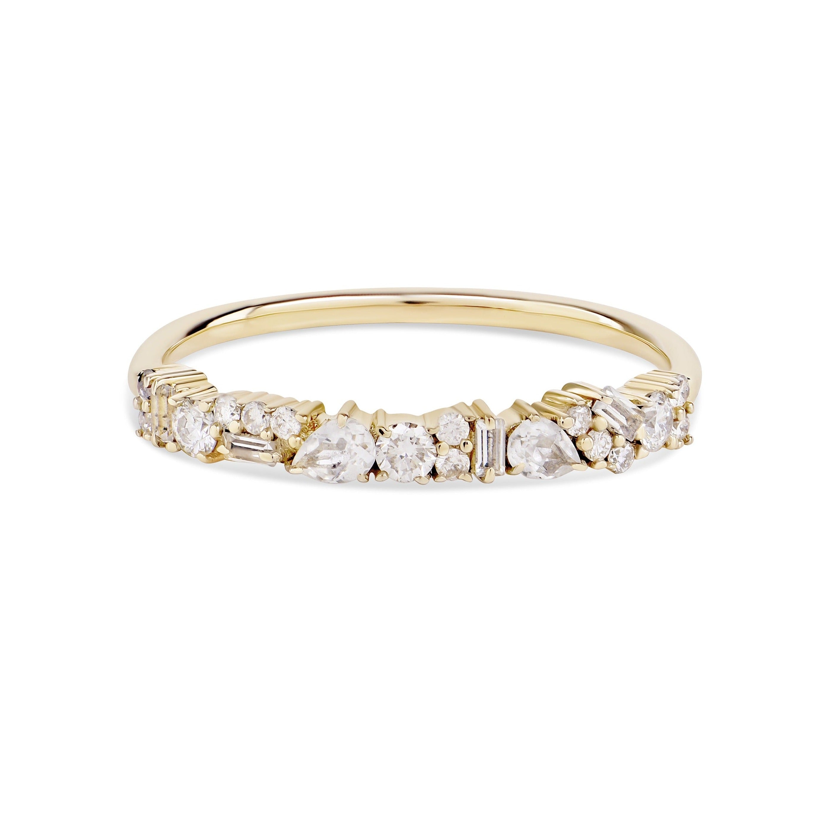 We are delighted to introduce the Scattered Diamond & White Topaz Baguette Ring. A beautiful combination of delicate diamonds and White Topaz in pear and baguette shaped stones.