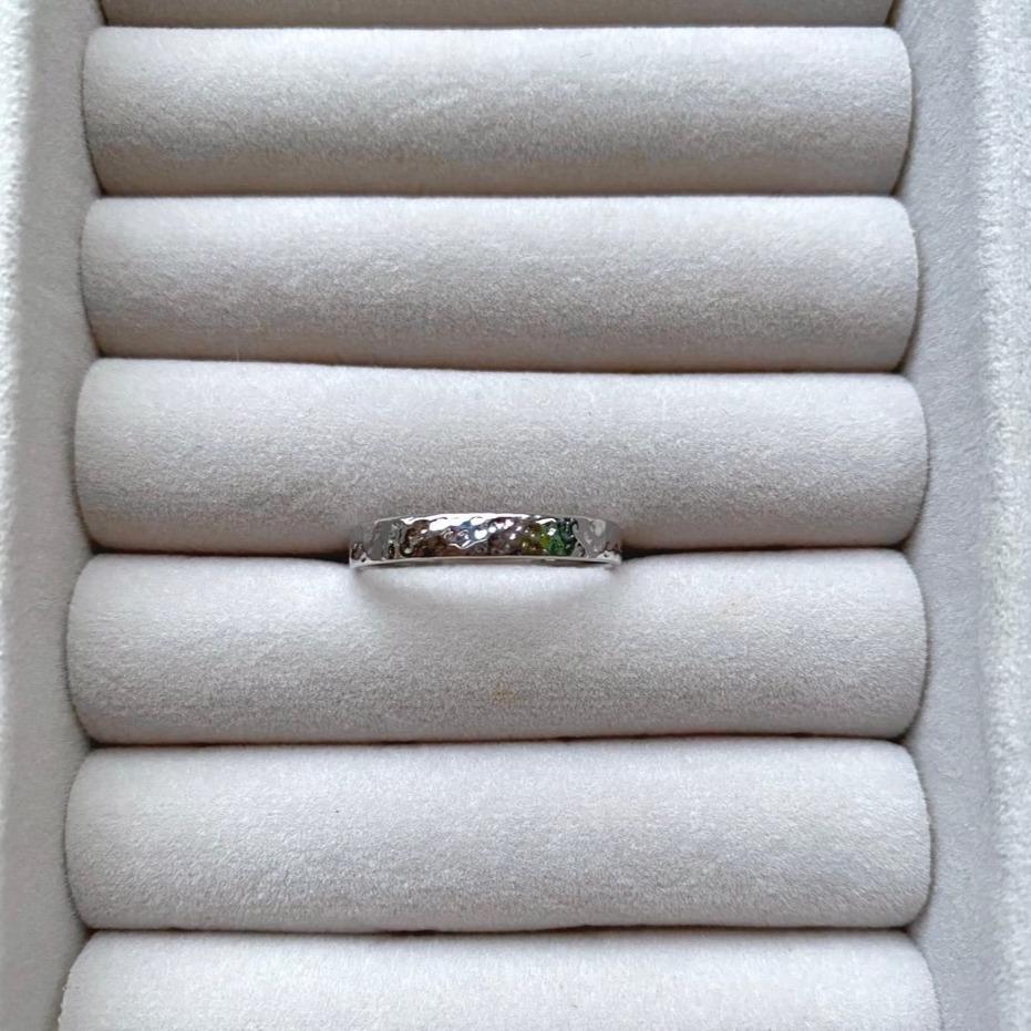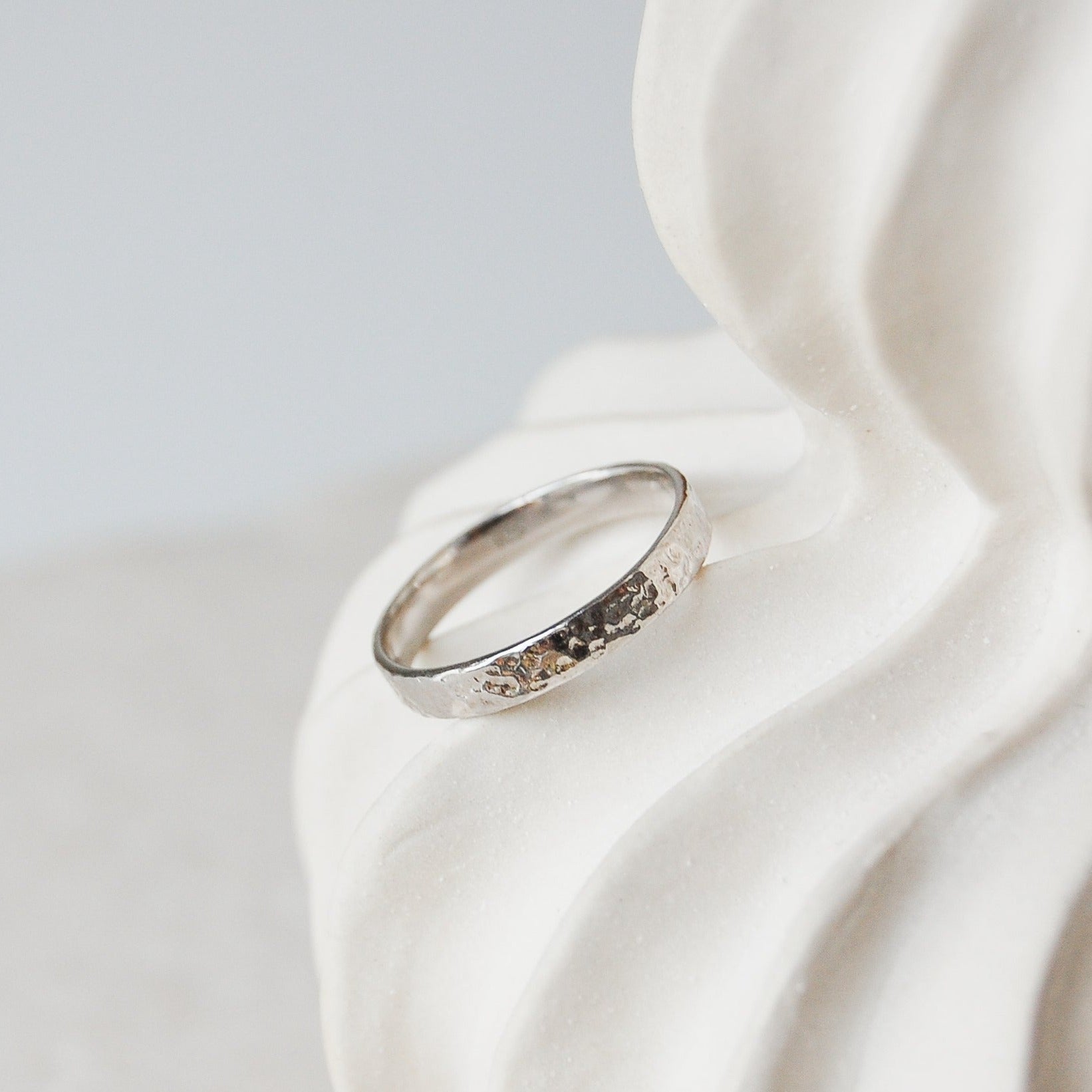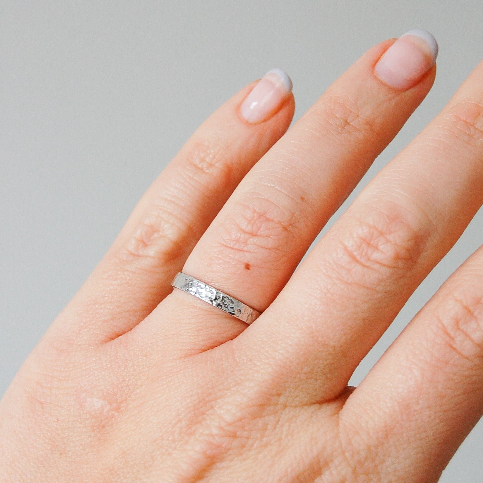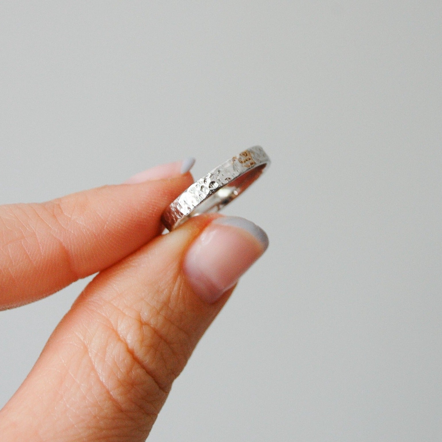 This gorgeous gold band will go with everything! Featuring this stunning hammered finish which is created by hand, this is a unique and special piece. It is also a beautiful option for a wedding band.