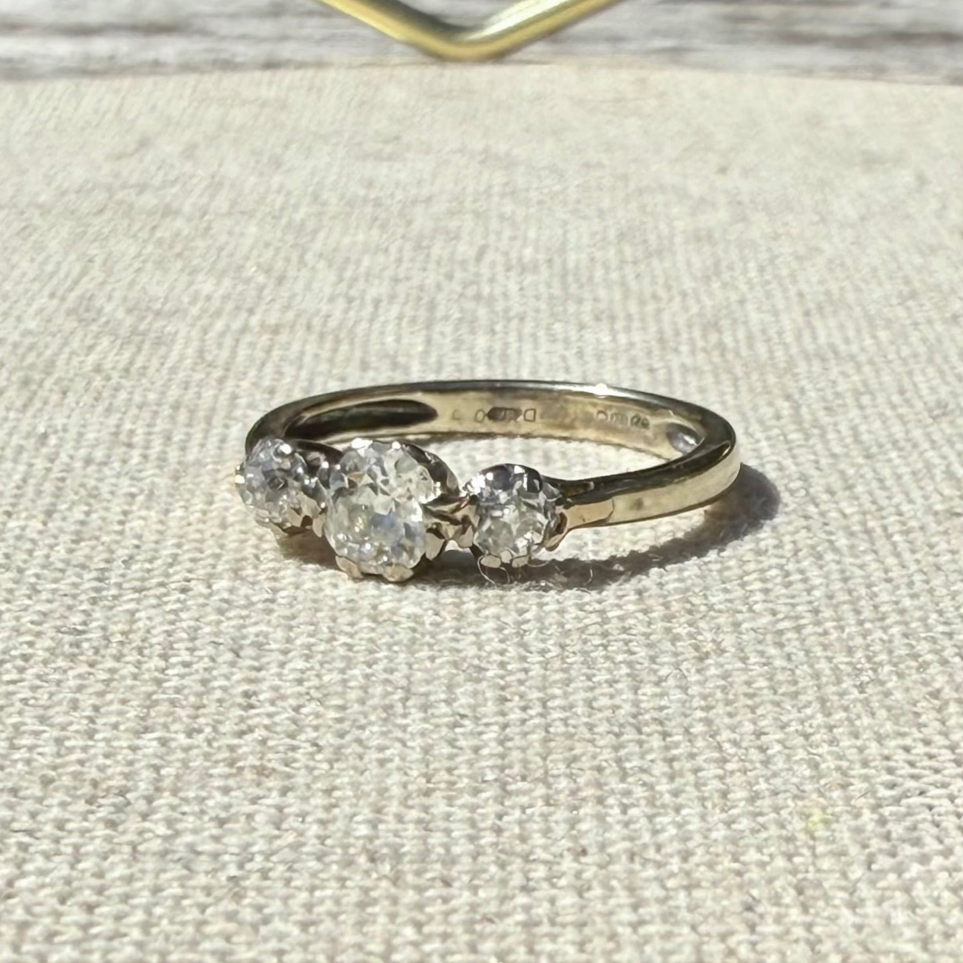 Elegant and effortlessly timeless, this vintage ring is crafted in classic 9kt gold and set with a trio of shimmering rose cut diamonds. Each stone is delicately claw-set, catching the light beautifully and offering subtle sparkle from every angle.