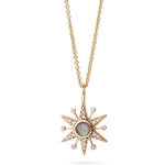 This beautiful, unique star pendant features a central iridescent labradorite surrounded by diamond-studded points and drops. Crafted in solid 9k yellow gold with ethically sourced stones, it's truly a special piece and a standout in any layered look.