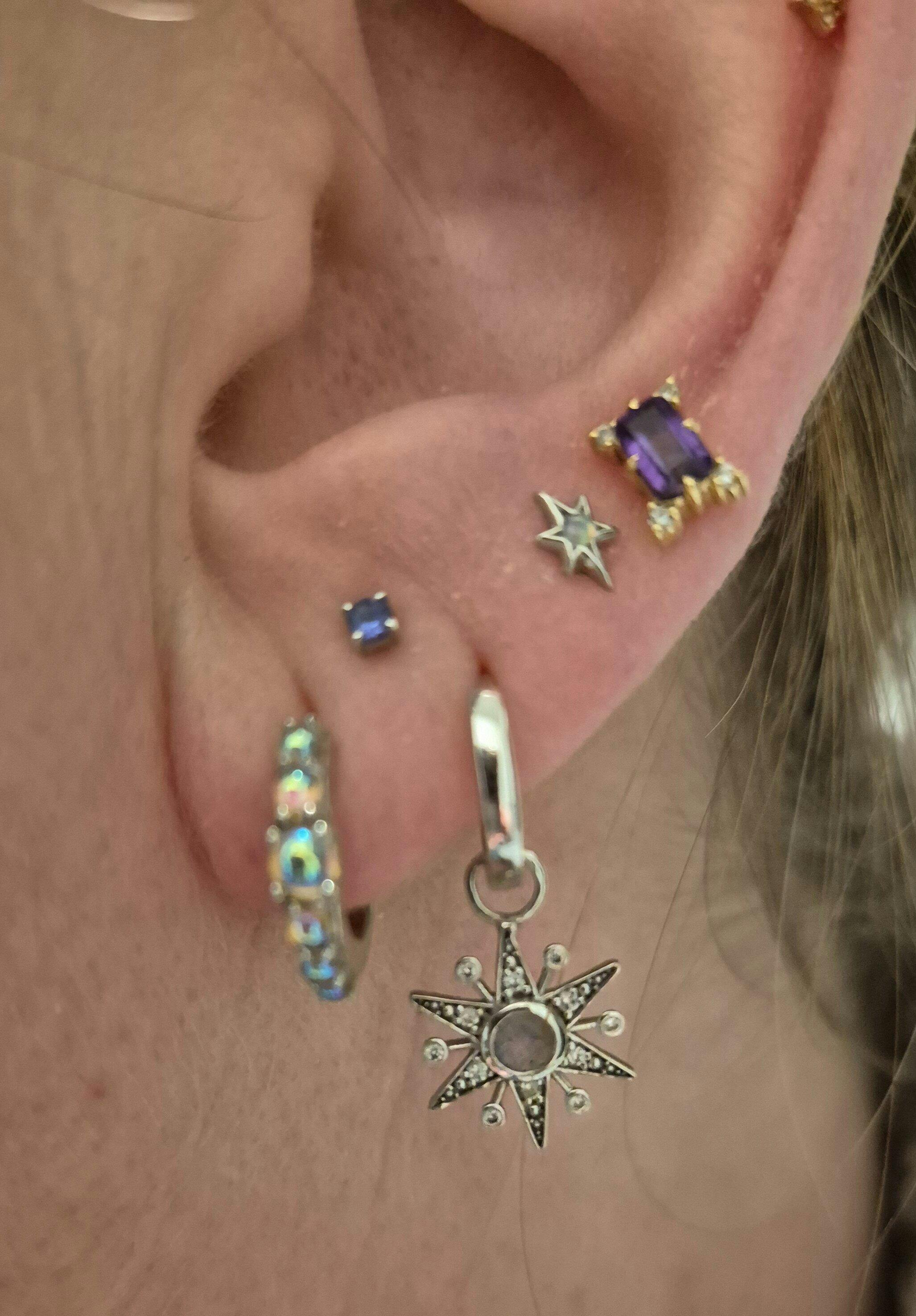 These stunning hoops feature a central iridescent labradorite stone surrounded by 12 sparkling diamonds in a star design. Made in solid 9k yellow gold with ethically sourced stones, they're perfect for everyday wear and a truly beautiful addition to any ear stack.